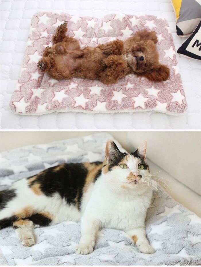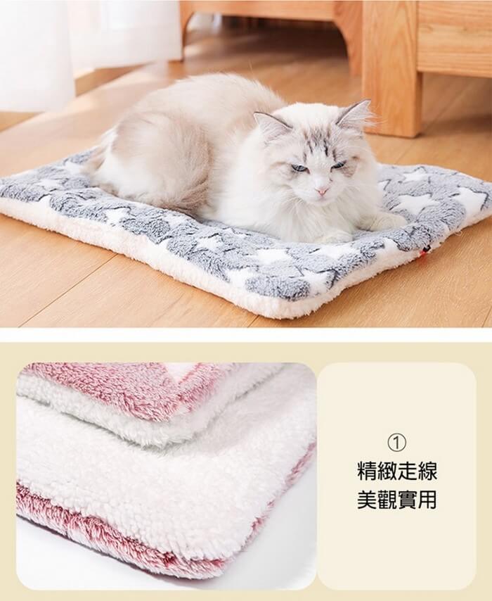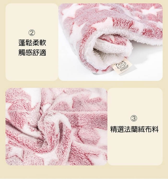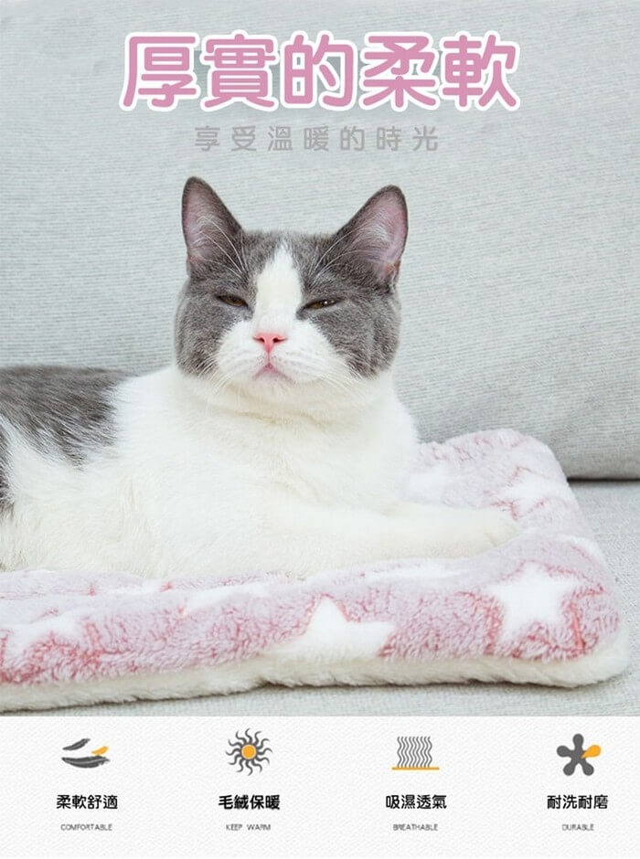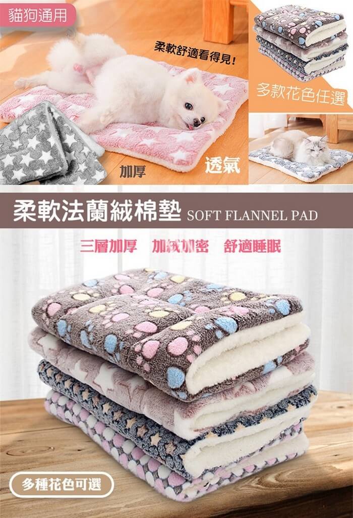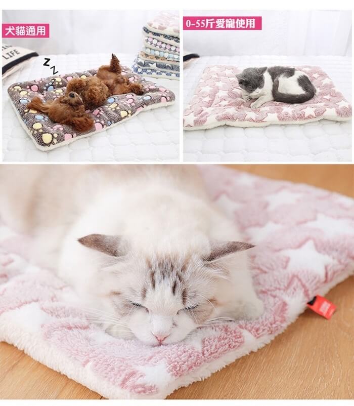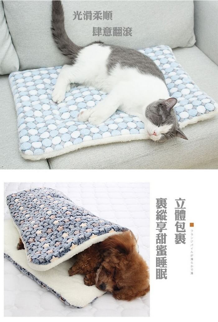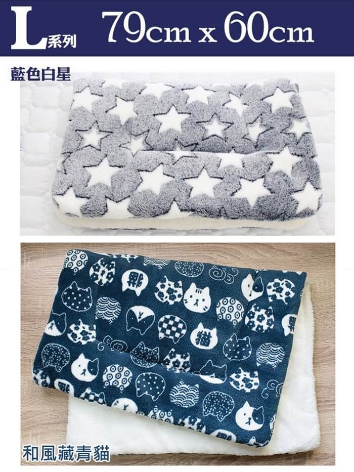 - 主商品尺寸/規格/重量/密度:品名:雙面柔軟法蘭絨保暖寵物墊 顏色 :藍色白星(L)、和風藏青貓(L)、粉色白星(XL) 材質 : 雙面材質-法蘭絨/羊羔絨 尺寸:L-79x60cm / XL-89x68cm