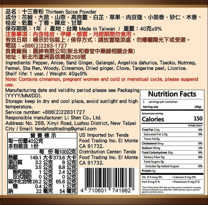 - 主商品尺寸/規格/重量:【商品規格】 品名 : 十三香粉 成分:花椒、大茴、山奈、高良薑、白芷、草果、肉豆蔻、小茴香、砂仁、木香、桂皮、乾薑、丁香、陳皮、甘草 規格:40g±9%/包 保存方式:請放置陰涼處勿曝曬陽光下或受潮 保存期限:1年 有效日期:標於包裝上 產地 : 台灣 【注意事項】 內含桂皮,孕婦.感冒.月經期間勿食用。