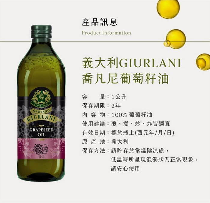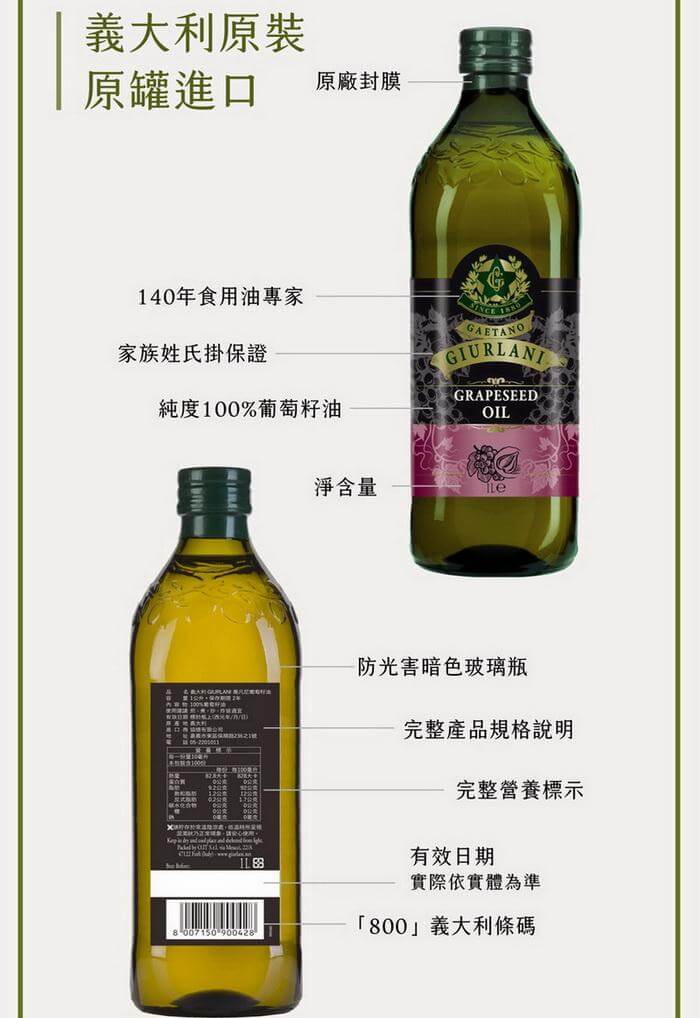 - 品名:Giurlani喬凡尼葡萄籽油禮盒組1000mlx6瓶