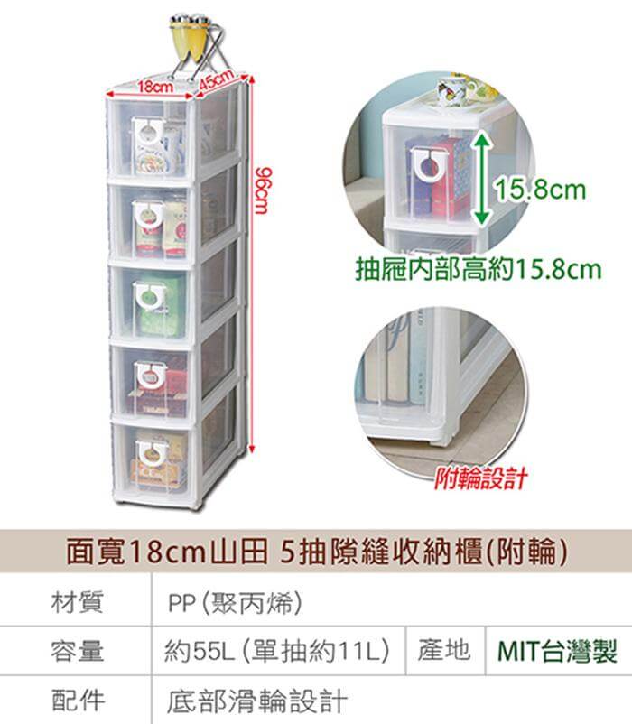 - 主商品尺寸/規格/重量/密度:品名:《真心良品》KEYWAY 山田5抽隙縫收納櫃(附輪)-1入 尺寸:約長45 × 寬18 × 高96cm (±1cm) 材質:P.P(聚丙烯) 顏色:雪白透明 容量:約55L(單抽約11L) 入數:1入 產地:台灣