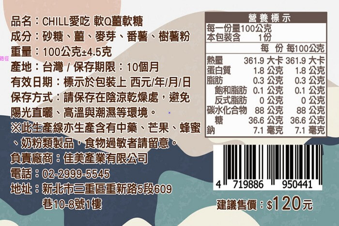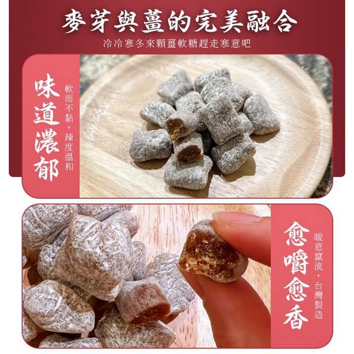 - 主商品尺寸/規格/重量:【產品規格】 品名 : 軟Q薑軟糖 成份 : 砂糖、薑、麥芽、番薯、樹薯粉 規格 : 100g±4.5g/包 產地:台灣 保存方式:請保存在陰涼乾燥處,避免陽光直曬、高溫、潮溼等環境 保存期限:10個月 有效日期:標示於包裝上 有效日期說明:150天~300天,以消費者收受日起算,至少距有效日期前150日以上 【注意事項】 ※過敏原信息 : 此生產線亦生產含有中藥、芒果、蜂蜜、奶粉類產品,食物過敏者請留意
