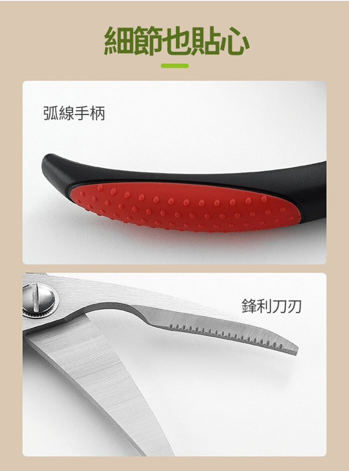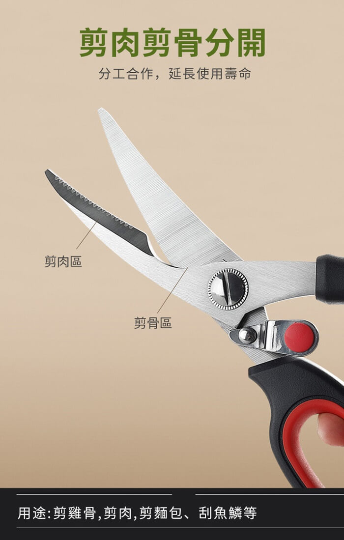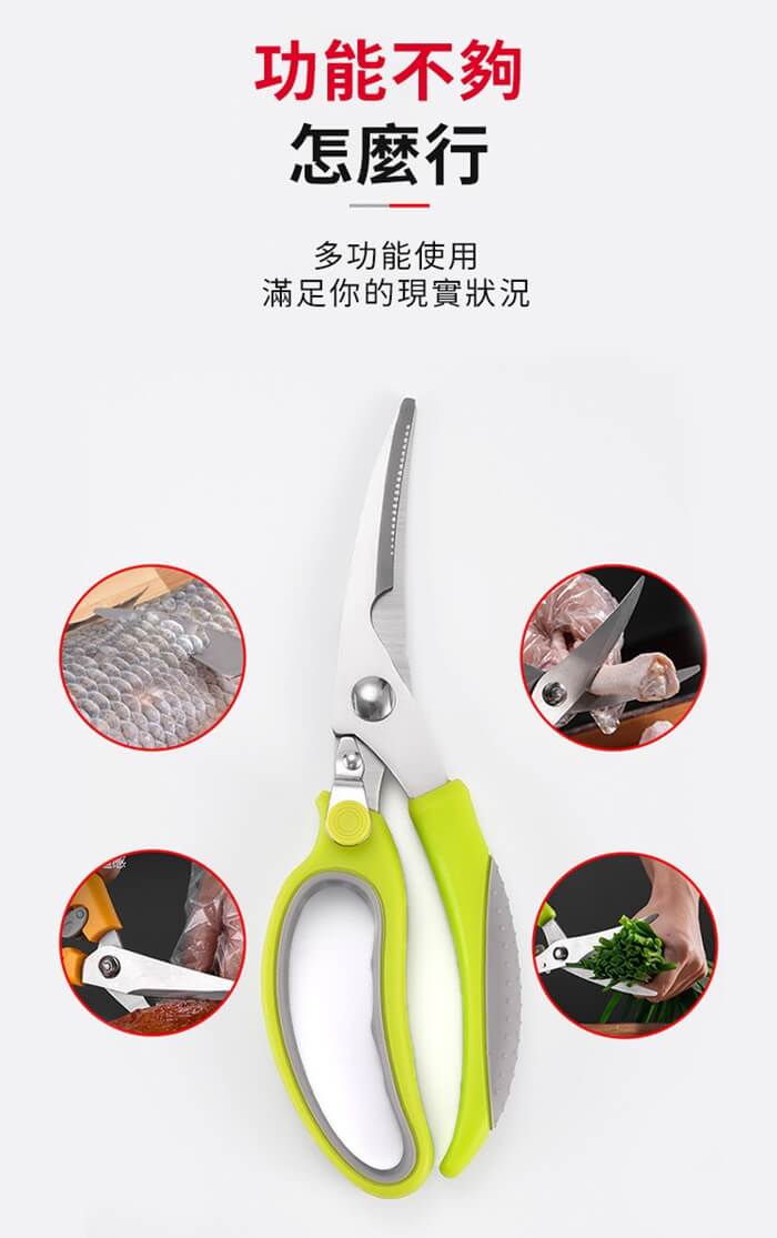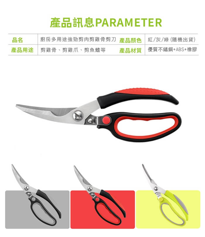 - 主商品尺寸/規格/重量/密度:品名:廚房多用途強勁剪肉剪雞骨剪刀(超值2入) 尺寸:23.4x7.5cm(±5%) 重量:150g(±5%) 顏色:綠色、紅色、灰色(隨機出貨)