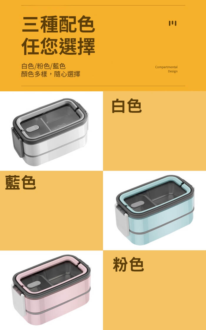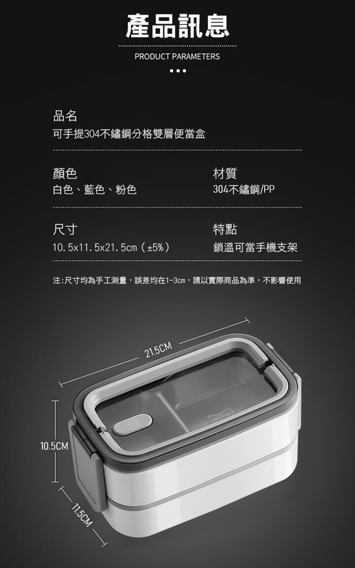 - 主商品尺寸/規格/重量/密度:品名:可手提304不鏽鋼分格雙層便當盒 重量:500g 尺寸:10.5x11.5x21.5cm(±5%) 顏色:白色、藍色、粉色
