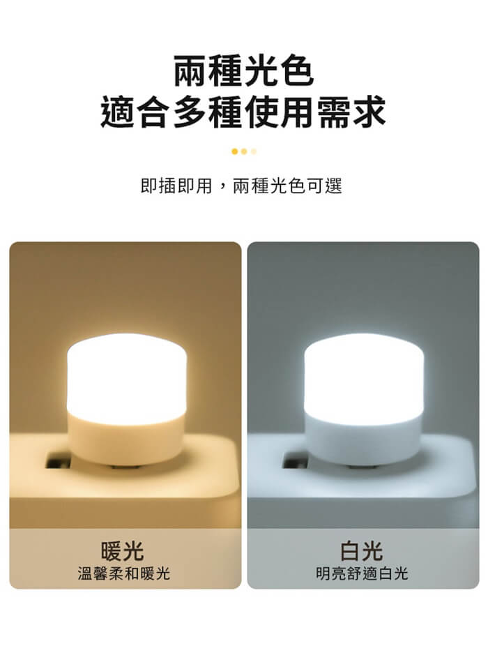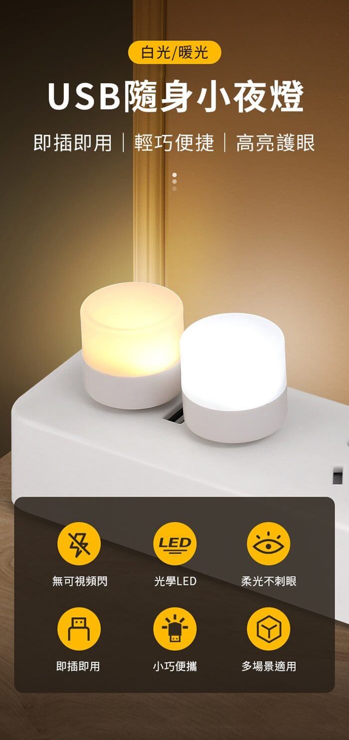 - 主商品尺寸/規格/重量:品名:隨身便攜usb迷你小夜燈(超值20入) 尺寸:5x3cm(±5%) 功率:1W 電壓:5V 款式:白光、暖光