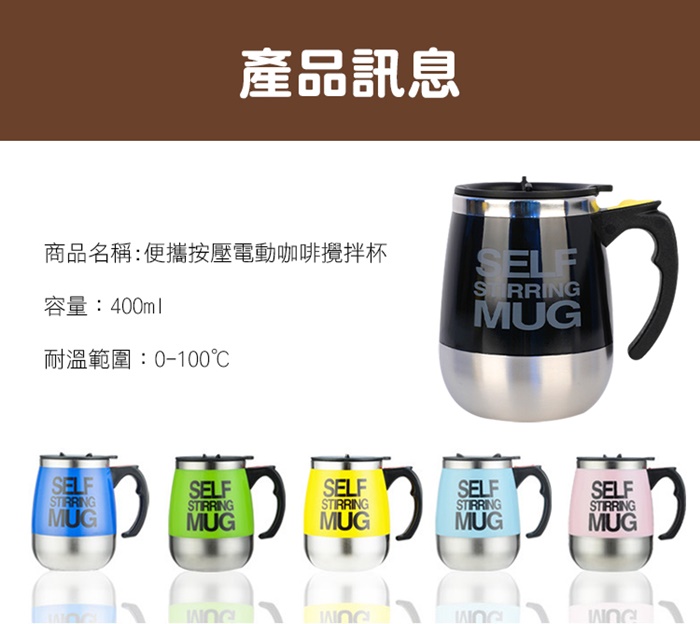 - 主商品尺寸/規格/重量/密度:品名:便攜按壓電動咖啡攪拌杯(超值2入) 尺寸:8.8x10.5x13cm(±5%) 容量:400ml(±5%) 重量:500g(±5%) 耐溫範圍:0-100℃ 顏色:黃色、粉色、綠色、深藍、淺藍、黑色(隨機出貨) 供電方式:四號電池x2(需自備) ■小提示:使用攪拌杯攪拌咖啡、飲品時,建議將攪拌輪取出後再飲用,避免誤食!