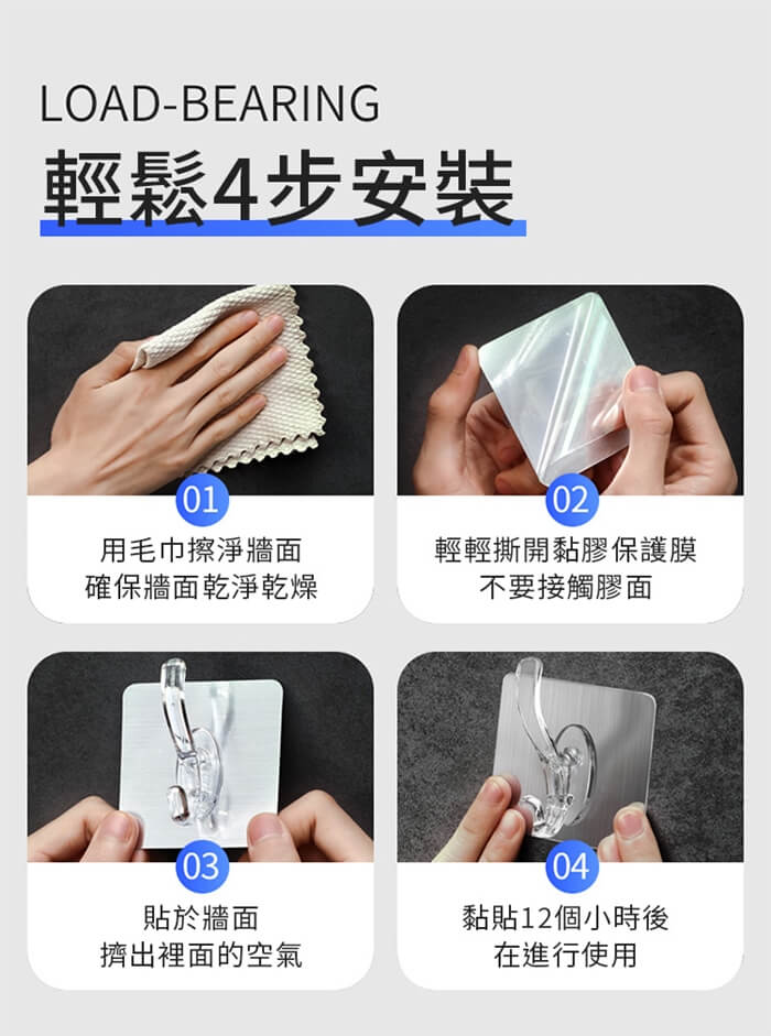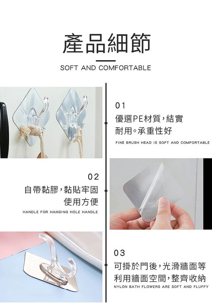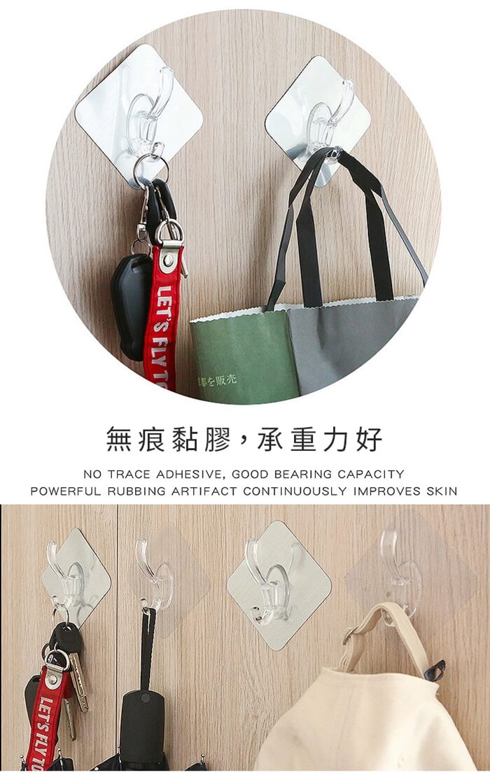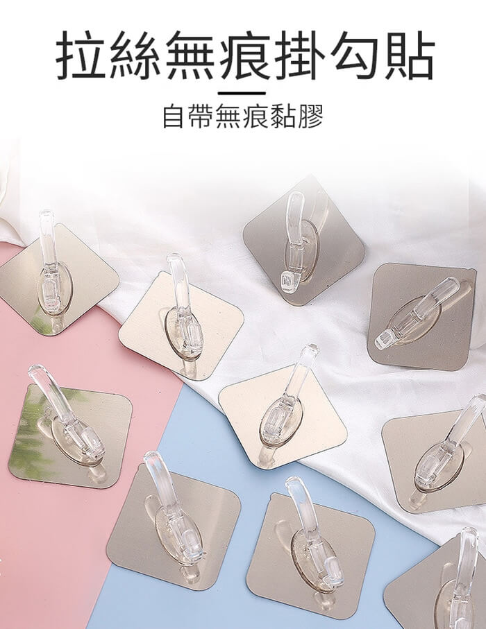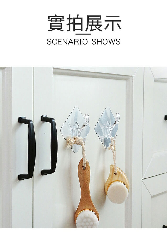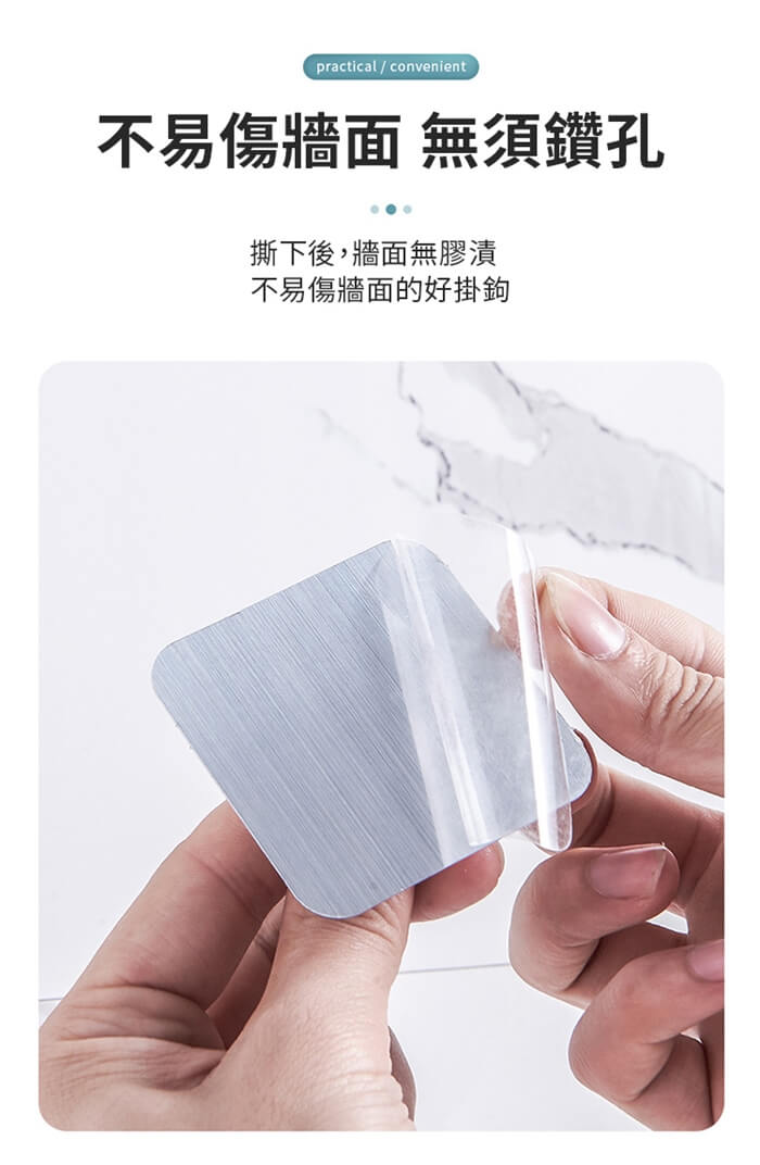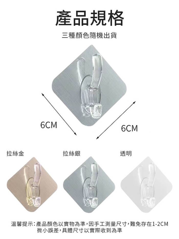 - 主商品尺寸/規格/重量/密度:品名:免打孔特大衣帽雙勾掛鉤(超值16入) 重量:50g 尺寸:6x6cm(±5%) 承重:5kg以內 顏色:拉絲銀、拉絲金、透明(隨機出貨)