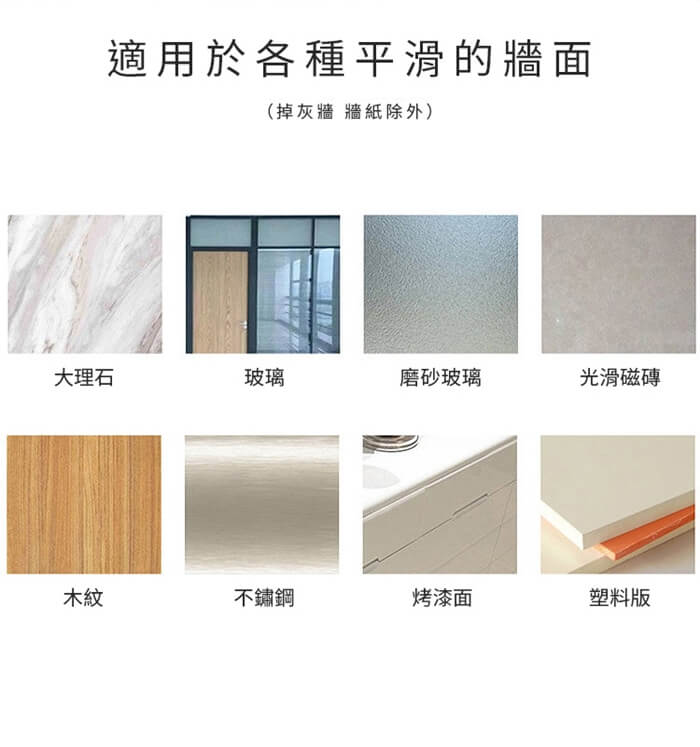 瓷磚、木板、玻璃門、不鏽鋼...多種墻面均可使用。