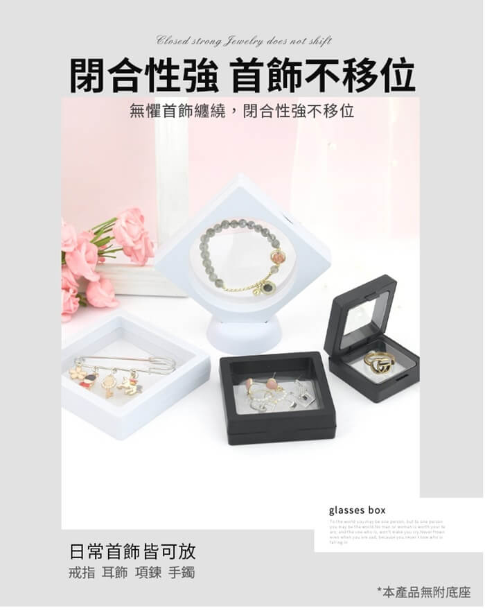 - 主商品尺寸/規格/重量/密度:品名:懸浮防氧化首飾收納盒(超值20入) 重量:300g 顏色:白色、黑色 尺寸:9x9x2cm(±5%)