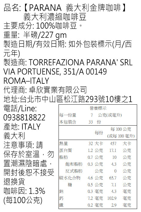 - 主商品:【PARANA 義大利金牌咖啡】金牌獎濃縮咖啡豆半磅
