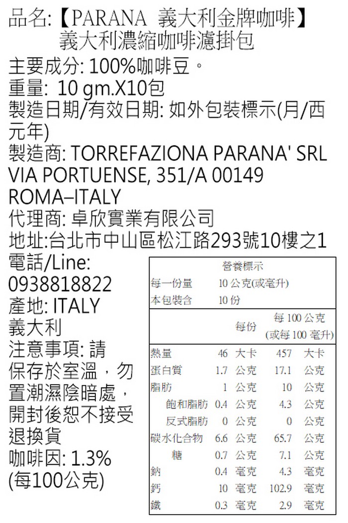 - 主商品:【PARANA 義大利金牌咖啡】金牌獎濃縮咖啡濾掛包 10包/盒