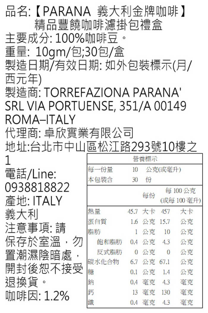 - 商品屬性:原裝進口 製造廠商或國內負責廠商名稱:卓欣實業有限公司 製造廠商或國內負責廠商電話:0938818822 製造廠商或國內負責廠商地址:台北市松江路293號10樓之1 食品業者登錄字號:A-170673922-00000-4