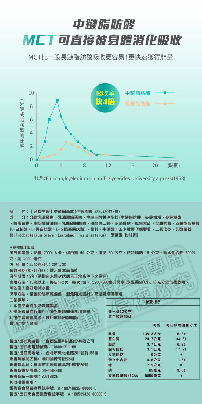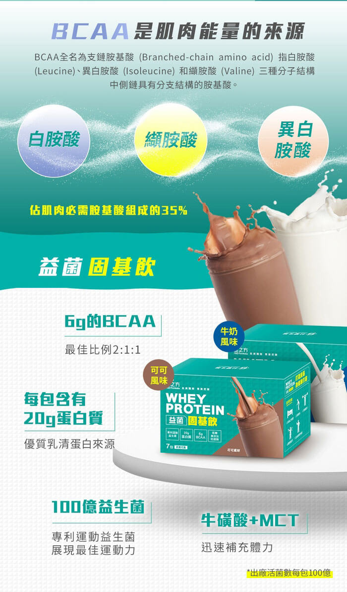 - 主商品尺寸/規格/重量:品 名:【台塑生醫】益菌固基飲(牛奶風味)(32g*30包/盒) 內 容 量:32公克/包;30包/盒 成 分:分離乳清蛋白、乳清濃縮蛋白、中鏈三酸甘油酯粉(中鏈脂肪酸、麥芽糊精、麥芽糖漿、酪蛋白鈉、脂肪酸甘油脂、乳酸硬脂酸鈉、磷酸氫二鉀、多磷酸鈉、維生素E)、全脂奶粉、支鏈型胺基酸(L-白胺酸、L-異白胺酸、L-α胺基異戊酸)、香料、牛磺酸、玉米糖膠(增稠劑)、二氧化矽、乳酸菌粉(Bifidobacterium breve、Lactobacillus plantarum)、蔗糖素(甜味劑) 營養標示:(每一份32公克/本包裝含30份)每份熱量 135.3大卡,蛋白質 20.7公克,脂肪 3.7公克,飽和脂肪 3.1公克,反式脂肪 0公克,碳水化合物 4.8公克,糖 2.9公克,鈉 65毫克,支鏈胺基酸(BCAA) 6000毫克 *參考值未訂定 每日參考值:熱量 2000 大卡、蛋白質 60 公克、脂肪 60 公克、飽和脂肪 18 公克、碳水化合物 300公克、鈉 2000 毫克 有效日期(年/月/日):標示於盒面(底) 保存期限:2年(係指在未開封狀態且正常條件下之保存) 食用方法:13歲以上,每日1-2次,每次1包,以250-300毫升開水(水溫需50℃以下)充分混勻後飲用,可依個人喜好增減水量 保存方法:請置於陰涼乾燥處,避免陽光直射、高溫及潮濕環境 注意事項: 1.本產品含有牛奶及其製品 2.避免孩童自行取用,開封後請盡速食用完畢 3.慢性腎臟病患者,食用前請諮詢醫師 原 產 地:台灣 製造/進口商名稱: 台塑生醫科技股份有限公司 製造/進口商電話號碼: 0800-211168 製造/進口商地址: 台北市敦化北路201號前棟5樓 販售商廠商名稱: 灝翎國際有限公司 販售商地址:桃園市中壢區龍昌路180巷20號 販售商電話號碼:03-4564488 販售商統一編號:80718835 其他揭露事項: 販售商食品業者登錄字號: H-180718835-00000-5 製造/進口商食品業者登錄字號:A-180539426-00000-5