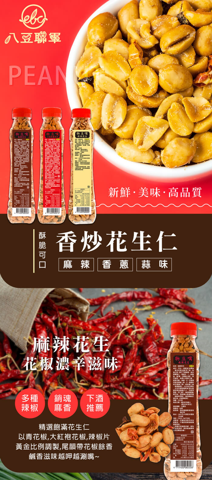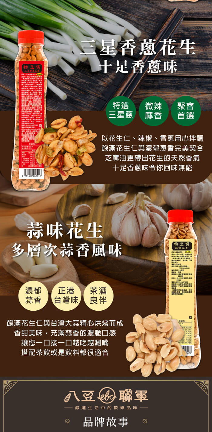 - 主商品:物豆嘴 麻辣花生/三星香蔥花生/蒜味花生x4罐(250g/罐)