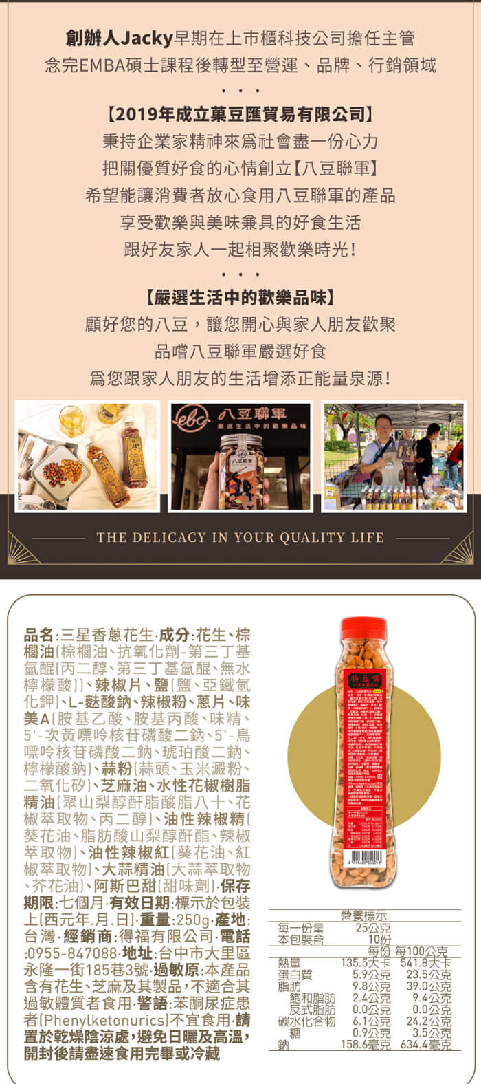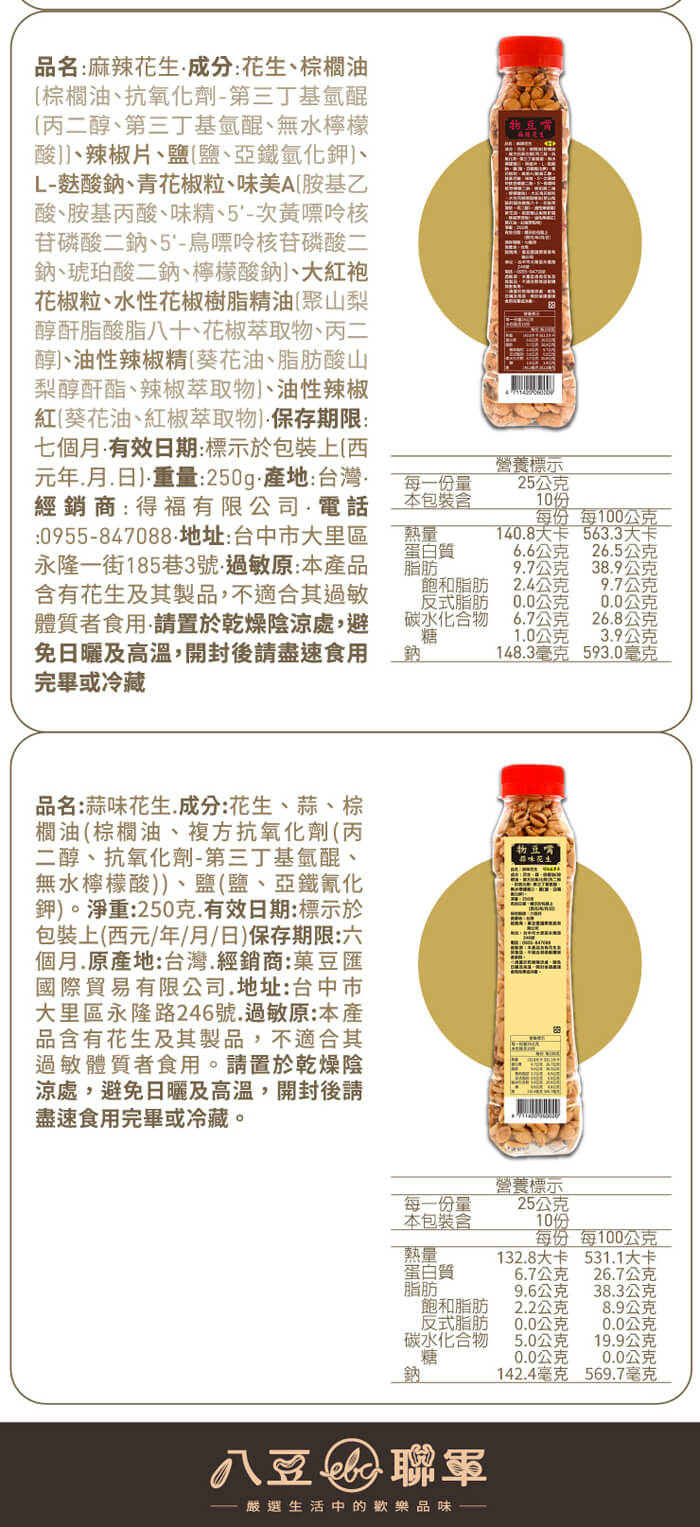 - 材質/食材:麻辣花生成分:花生、棕櫚油(棕櫚油、抗氧化劑-第三丁基氫?(丙二醇、第三丁基氫?、無水檸檬酸)﹞、辣椒片、鹽(鹽、亞鐵氫化鉀)、L-麩酸鈉、青花椒粒、味美A(胺基乙酸、胺基丙酸、味精、5'-次黃嘌呤核?磷酸二鈉、5'-鳥嘌哈核?磷酸二鈉、琥珀酸二鈉、檸檬酸鈉)、大紅袍花椒粒、水性花椒樹脂精油(聚山梨醇酐脂酸脂八十、花椒萃取物、丙二醇)、油性辣椒精(葵花油、脂肪酸山梨酐脂、辣椒萃取物)、油性辣椒紅(葵花油、紅椒萃取物) 營養標示:每份熱量140.8Kcal、蛋白質6.6g、脂肪9.7g、飽和脂肪2.4g、反式脂肪0g、碳水化合物6.7g、糖1.0g、鈉148.3mg 過敏原:本產品含有花生及其製品,不適合其過敏體質者食用 保存期限:七個月(請置於乾燥陰涼處,避免日曬及高溫,開封後請盡速食用完畢或冷藏) 三星香蔥花生成分:花生、棕櫚油(棕櫚油、抗氧化劑-第三丁基氫?(丙二醇、第三丁基氫?、無水檸檬酸)﹞、辣椒片、鹽(鹽、亞鐵氫化鉀)、L-麩酸鈉、辣椒粉、蔥片、味美A(胺基乙酸、胺基丙酸、味精、5'-次黃嘌呤核?磷酸二鈉、5'-鳥嘌哈核?磷酸二鈉、琥珀酸二鈉、檸檬酸鈉)、蒜粉(蒜頭、玉米澱粉、二氧化矽、芝麻油、水性花椒樹脂精油(聚山梨醇酐脂酸脂八十、花椒萃取物、丙二醇)、油性辣椒精(葵花油、脂肪酸山梨酐脂、辣椒萃取物)、油性辣椒紅(葵花油、紅椒萃取物)、大蒜精油(大蒜萃取物、芥花油、阿斯巴甜(甜味劑) 營養標示:每份熱量135.5Kcal、蛋白質5.9g、脂肪9.8g、飽和脂肪2.4g、反式脂肪0g、碳水化合物6.1g、糖0.9g、鈉158.6mg 過敏原:本產品含有花生、芝麻及其製品,不適合其過敏體質者食用 ※警語:苯酮尿症患者(Phenylketonurics)不宜食用 保存期限:七個月(請置於乾燥陰涼處,避免日曬及高溫,開封後請盡速食用完畢或冷藏) 蒜味花生成分:花生、蒜、棕櫚油(棕櫚油、複方抗氧化劑(丙二醇、抗氧化劑-第三丁基氫餛、無水檸檬酸))、鹽(鹽、亞鐵氣化鉀) 營養標示:每份熱量132.8Kcal、蛋白質6.7g、脂肪9.6g、飽和脂肪2.2g、反式脂肪0g、碳水化合物5g、糖0.9g、鈉142.4mg 過敏原:本產品含有花生及其製品,不適合其過敏體質者食用 保存期限:六個月(請置於乾燥陰涼處,避免日曬及高溫,開封後請盡速食用完畢或冷藏)