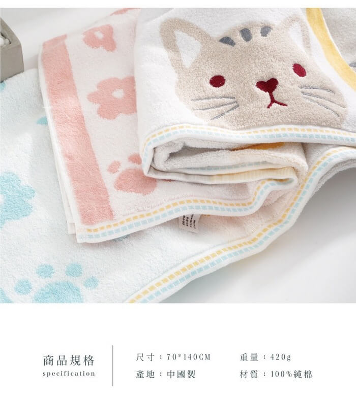 - 主商品尺寸/規格/重量/密度:【產品規格】 品名 : 日系櫻花貓純棉浴巾 顏色 : 藍色/粉色 材質 : 100%純綿 尺寸 : 70x140公分 重量 : 420g (±10%) BSMI商檢字號 : M53938
