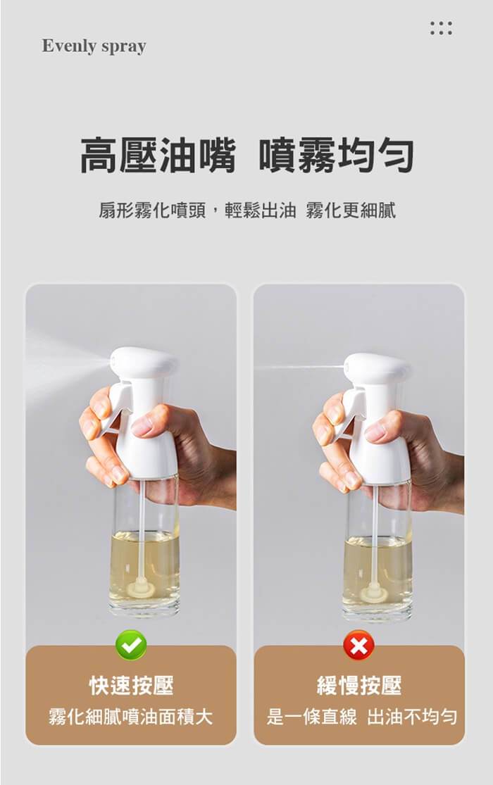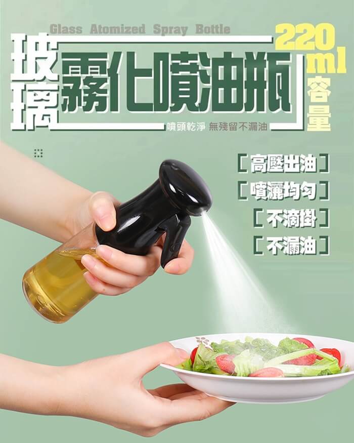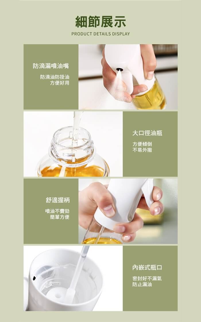 - 主商品尺寸/規格/重量/密度:品名:精準控油玻璃霧化噴油瓶200ml(超值4入) 尺寸:5.5x5.5x20cm 容量:200ml(±5%) 顏色:黑色、白色(隨機出貨)