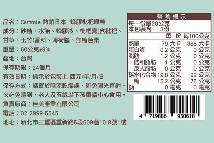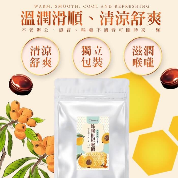 - 主商品:【cammie】蜂膠枇杷喉糖(60g/包)x12包