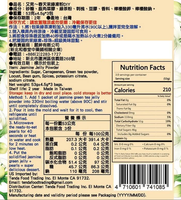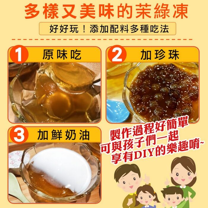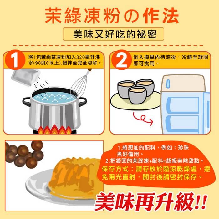 - 主商品尺寸/規格/重量:【產品規格】 品名 : 茉綠茶凍粉 規格 : 53g±4.5g/包,1袋內含3包 成份 : 砂糖,鹿角菜膠,綠茶粉,刺槐.豆膠,香料,檸檬酸鉀,檸檬酸鈉 保存方式:請放置陰涼處勿受潮或直射太陽,冷藏保存更佳 保存期限:2年 製造日期:標於包裝上 產地 : 台灣 【美味綠茶凍作法】 1.將1包茉綠茶凍粉加入330毫升沸水(90C以上),攪拌至完全溶解。 2.倒入模具內待涼後,冷藏至凝固即可食用。 3.將喜愛的配料 例如珍珠.鮮奶油...等等 先一旁備用。 4.把凝固的茉綠凍+喜愛的配料=超級美味甜點。