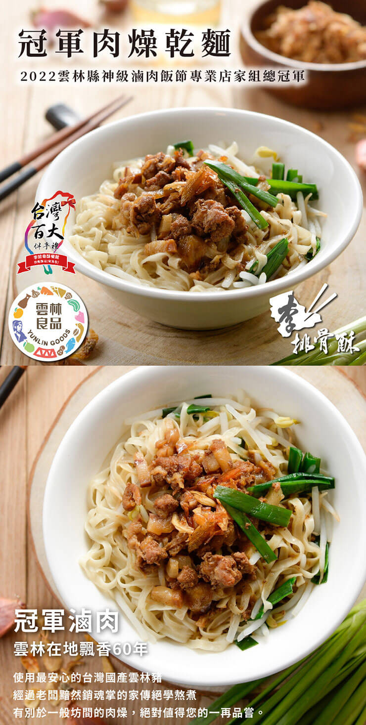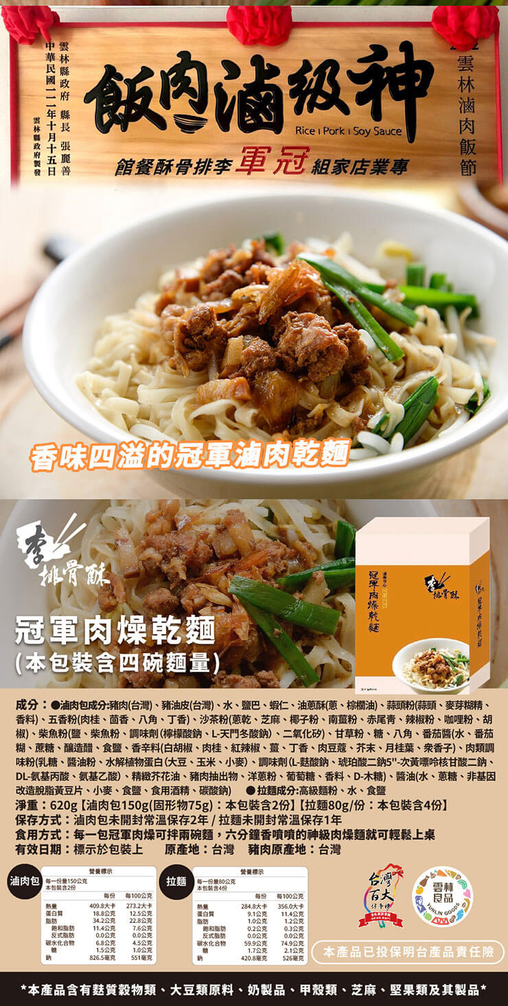 - 主商品尺寸/規格/重量:內容物名稱:冠軍肉燥乾麵 規格:2盒(4人份/盒) 內容量:620g(滷肉包150g(固形物75g):本包裝含2份)(拉麵80g/份:本包裝含4份)