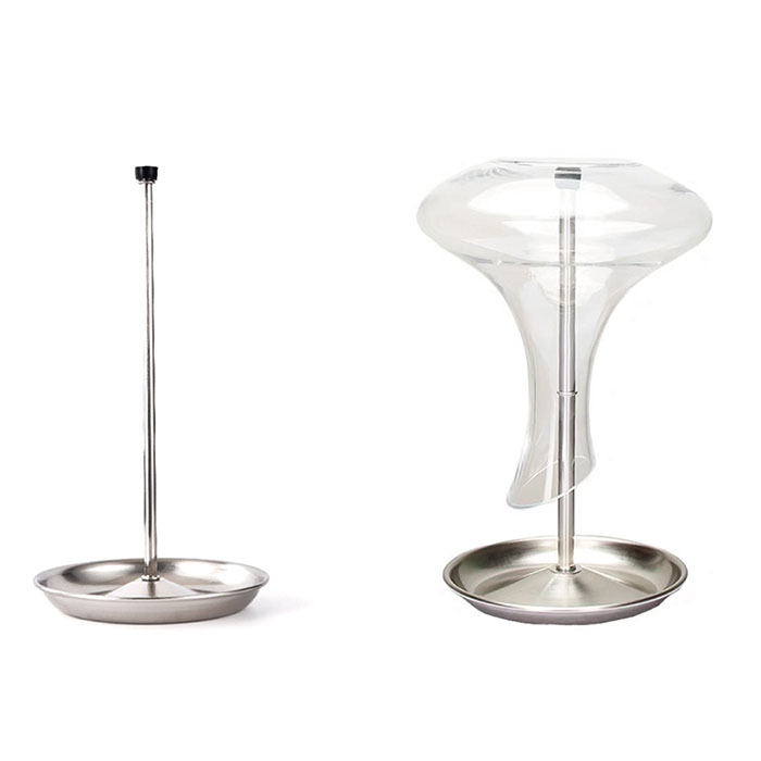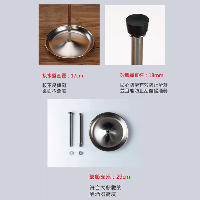 - 主商品尺寸/規格/重量/密度:品名:BOHEMIAN波西米亞人/ 醒酒器瀝水支架 編號:CYFDRAINER/B2 尺寸: 接水盤直徑17cm,較不易傾倒,桌面不會濕。 矽膠頭直徑18mm,貼心防滑有效防止滑落,並且能防止刮傷醒酒器。 鍍鉻支架29cm,符合大多數的醒酒器高度。