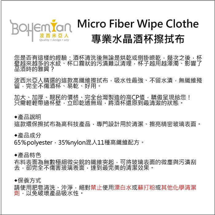 - 主商品:《BOHEMIAN波西米亞人》Micro Fiber Wipe Clothe 專業水晶杯擦拭布(1入)