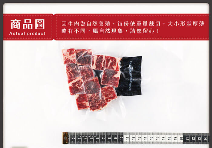 4.牛肉為天然養殖,依標示重量裁切包裝,大小及形狀厚薄略有不同,屬自然現象,請您留心!