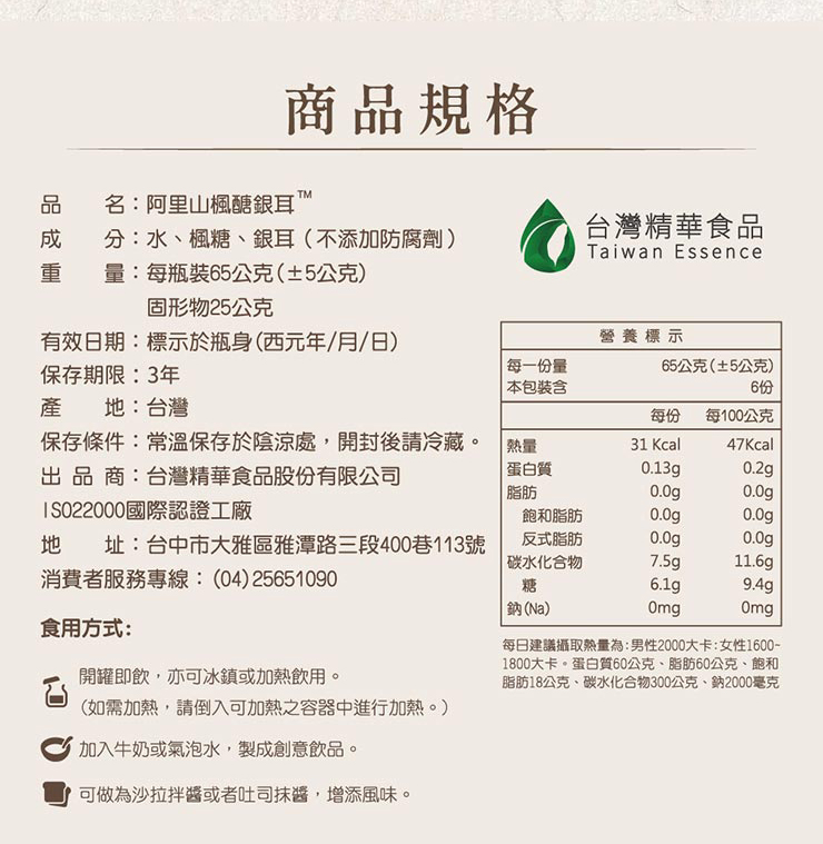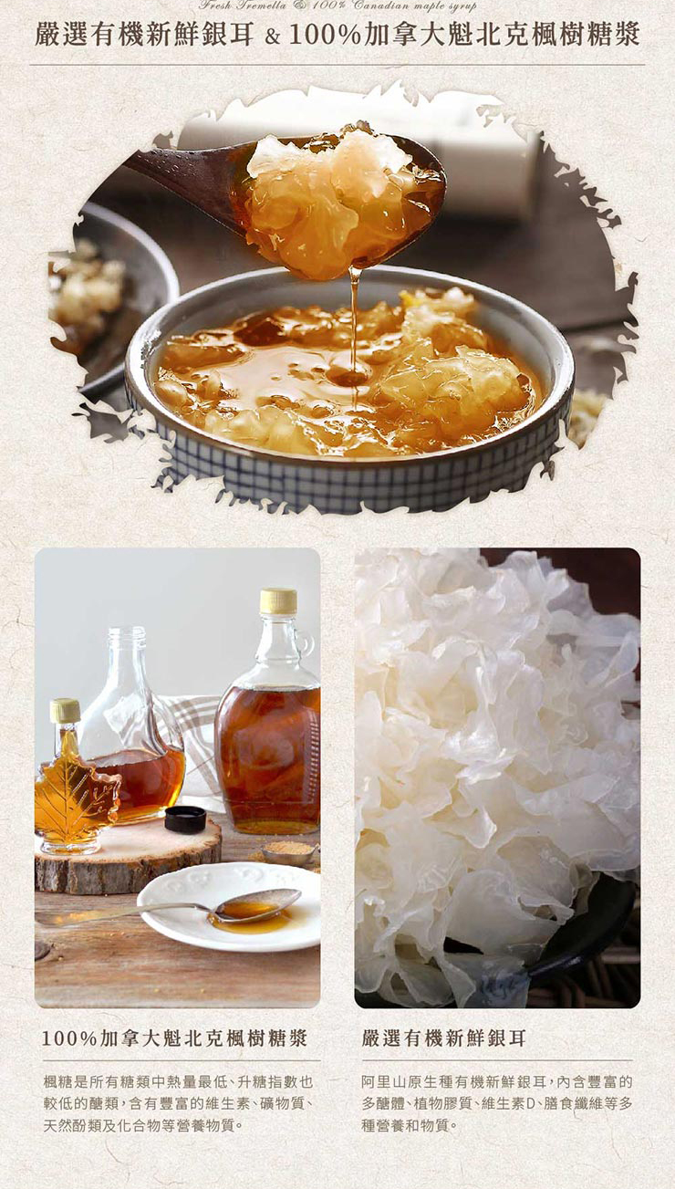 - 材質/食材:成分:水、楓糖、銀耳 營養標示:每份熱量31Kcal、蛋白質0.13g、脂肪0.0g、飽和脂肪0.0g、反式脂肪0.0g、碳水化合物7.5g、糖6.1g、鈉0mg