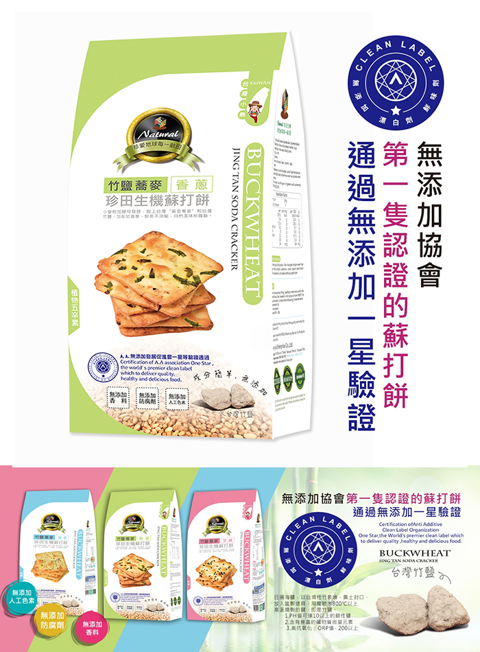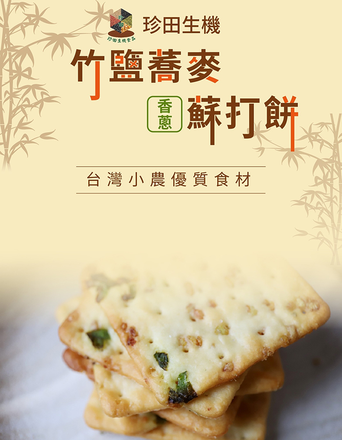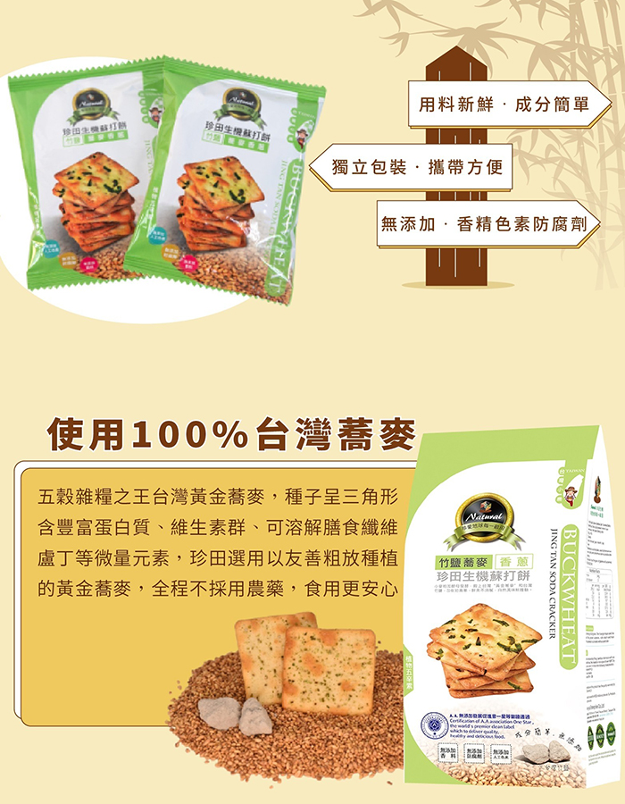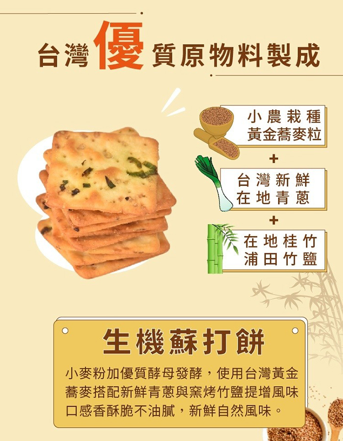 - 主商品:竹鹽蕎麥生機蘇打餅-香蔥162g/包 (18公克 X 9包)6入組