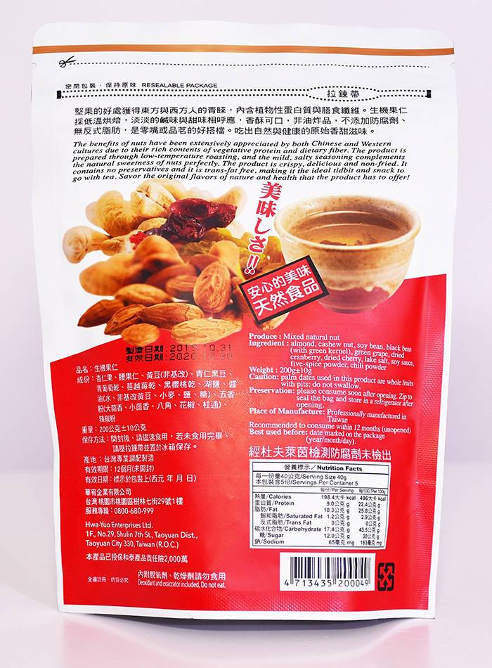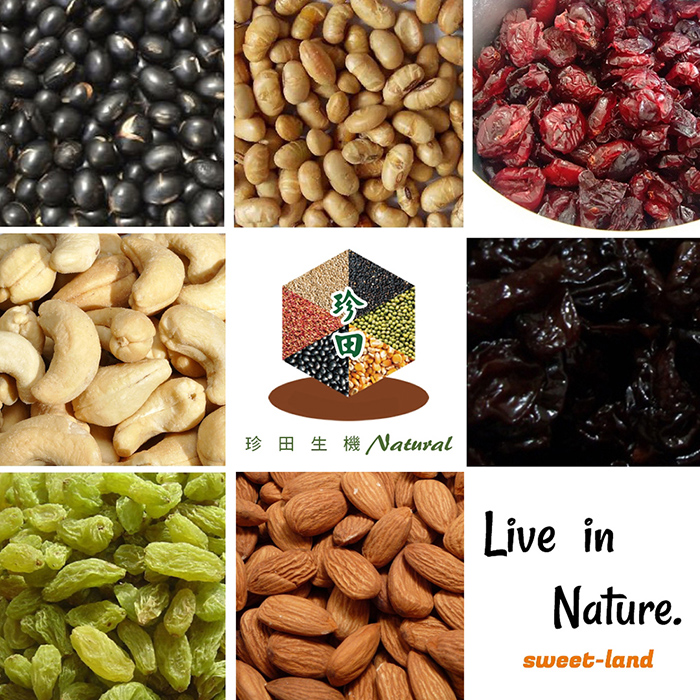- 材質/食材:杏仁果、腰果仁、黃豆(非基改)、青仁黑豆、菁葡萄乾、蔓越莓乾、黑櫻桃乾、湖鹽、醬油(水、非基改黃豆、小麥、鹽、糖)、五香粉(大茴香、小茴香、八角、花椒、桂通)、辣椒粉