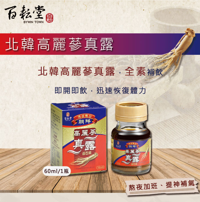 - 主商品:百耘堂高麗蔘真露 60毫升(瓶)/(6瓶/盒)*4