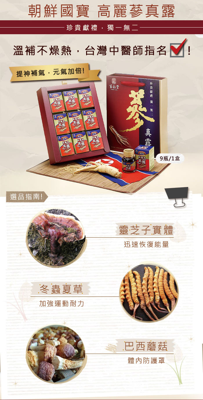 - 贈品:百耘堂高麗蔘真露 60毫升(瓶)*2