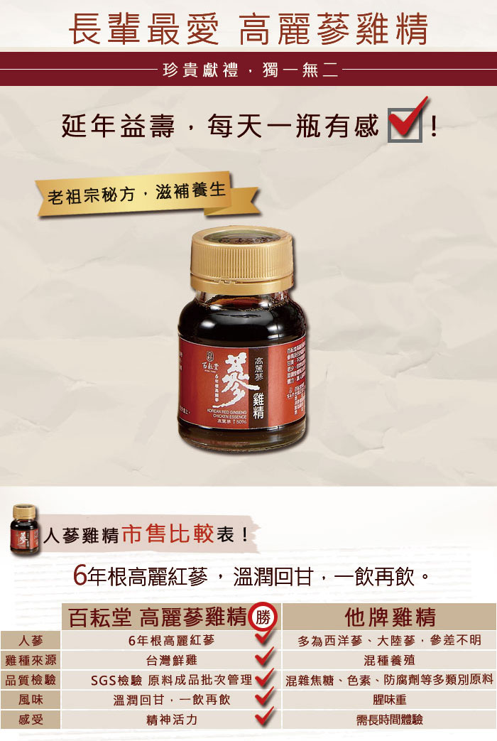 - 贈品食材/材質/成分/營養標示:高麗蔘增量50% 感受力十足 溫潤好吸收 增強體力 產前產後或病後之補養 健康維持 嚴格品質 不添加防腐劑、人工香料、色素 珍貴六年根高麗蔘 體驗六年根紅蔘芳香口感 六年根紅蔘精 獨家大韓民國珍貴皂苷精華 精挑台灣上等鮮雞 健康農場培育,活力看得見 特選巴西蘑菇 又稱為姬松茸,與高麗蔘完美融合口感,不添加防腐劑常溫可保存三年。