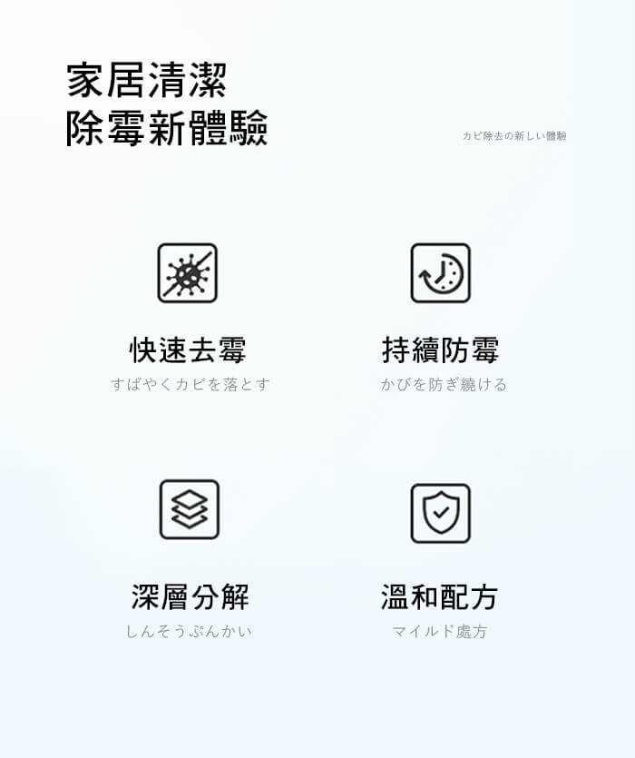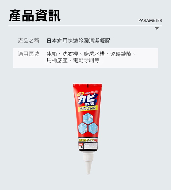- 主商品尺寸/規格/重量/密度:品名:日本家用快速除霉清潔凝膠120g(超值4入) 容量:120g(±5%) 有效期:3年
