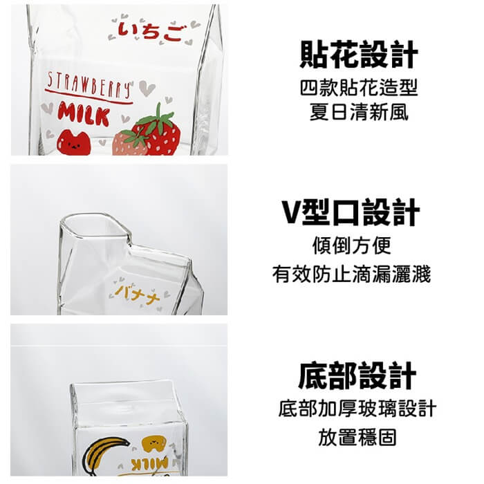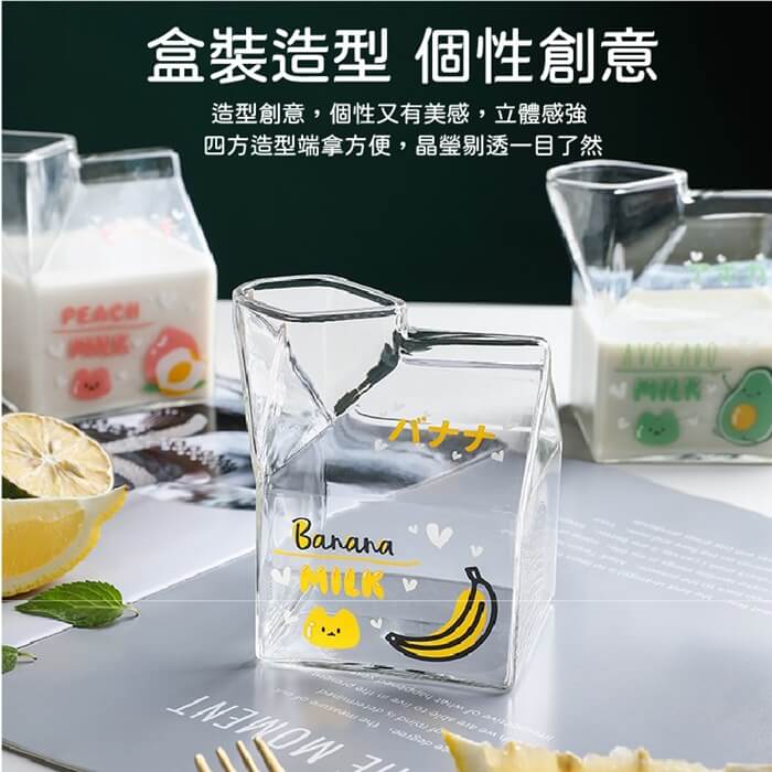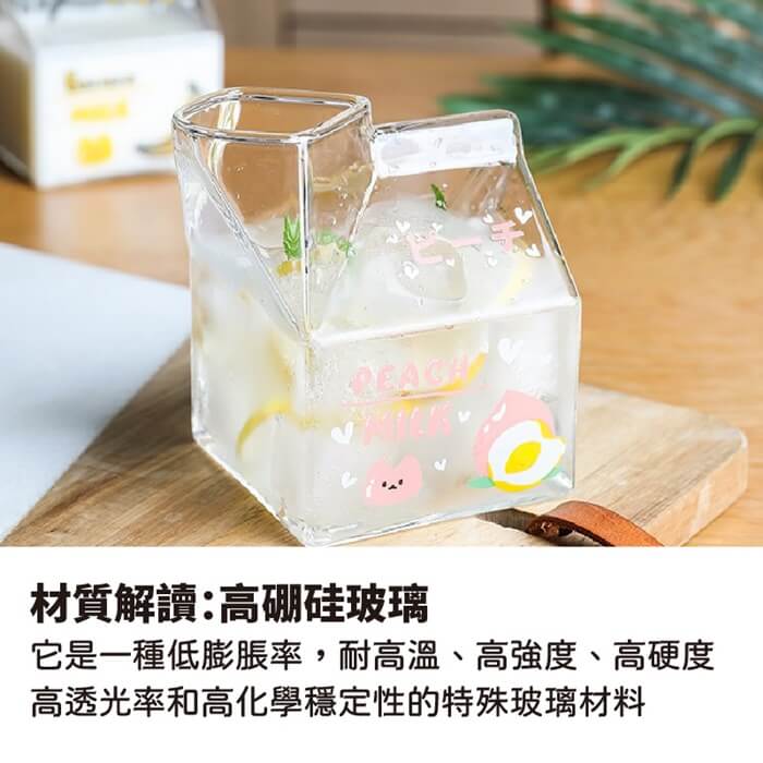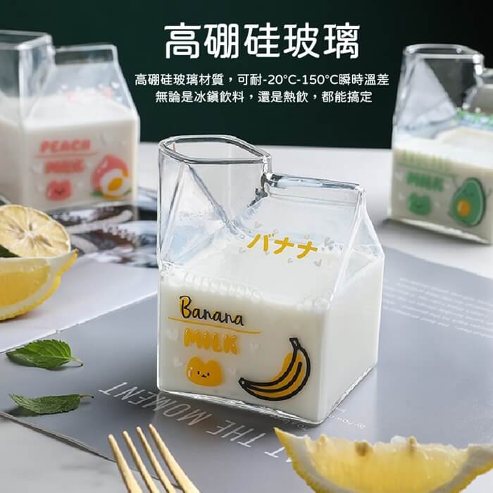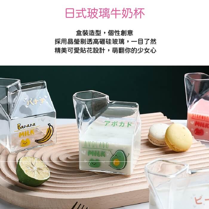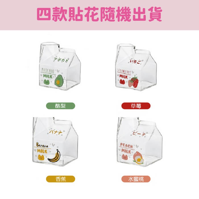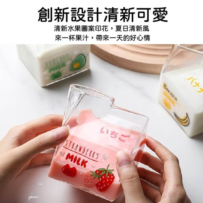 - 主商品尺寸/規格/重量/密度:品名:日式創意可愛玻璃牛奶杯(超值2入) 尺寸:10x7x5cm(±5%) 容量:350ml(±5%) 款式:水蜜桃、草莓、牛油果、香蕉(隨機出貨) 耐熱溫度:-20℃~150℃