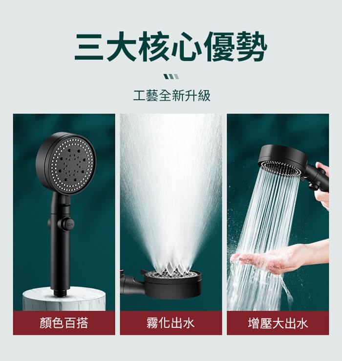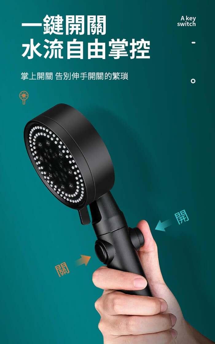 - 主商品尺寸/規格/重量/密度:品名:五檔一鍵增壓止水蓮蓬頭(超值4入) 尺寸:9.5x27cm(±5%) 材質:ABS 顏色:黑色 產地:中國 適用接口:適用於標準四分接口 內容物:蓮蓬頭x4