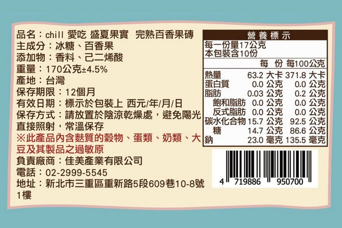 - 主商品產地:【責任廠商】 負責廠商 : 佳美產業有限公司 地址 : 新北市三重區重新路5段609巷10-8號 電話 : 02-29995545 食品業者登錄字號 : F-183107437-00000-6 產品責任險字號 : 1516 字第09PD03471號