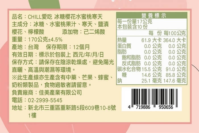 - 主商品產地:【責任廠商】 負責廠商 : 佳美產業有限公司 地址 : 新北市三重區重新路5段609巷10-8號 電話 : 02-29995545 食品業者登錄字號 : F-183107437-00000-6 產品責任險字號 : 1516 字第09PD03471號