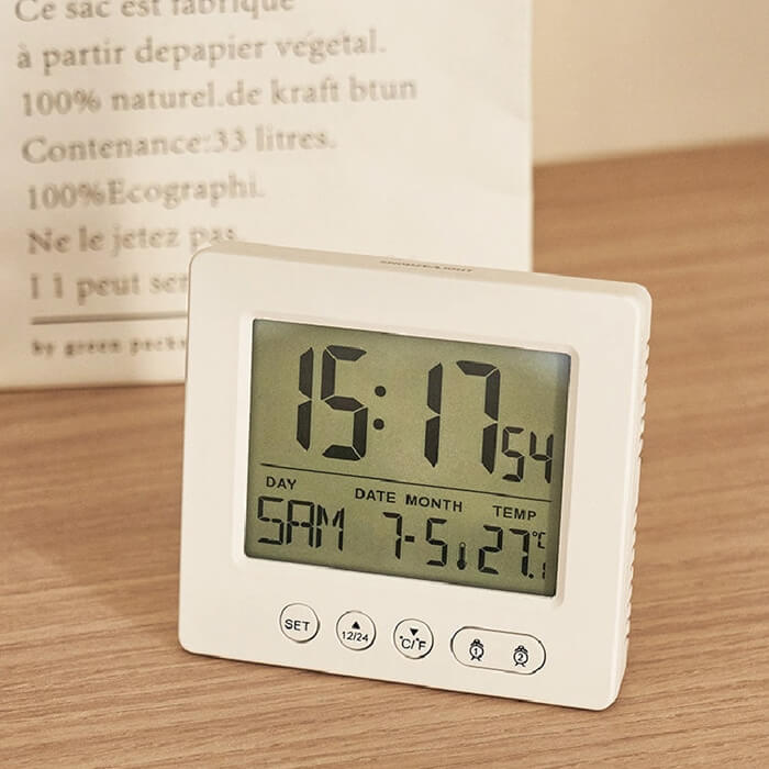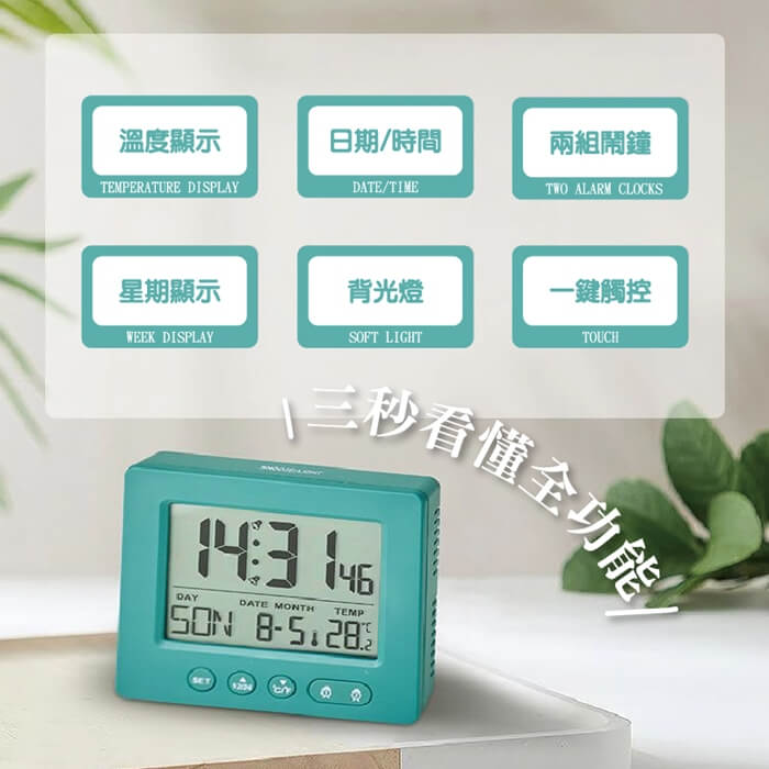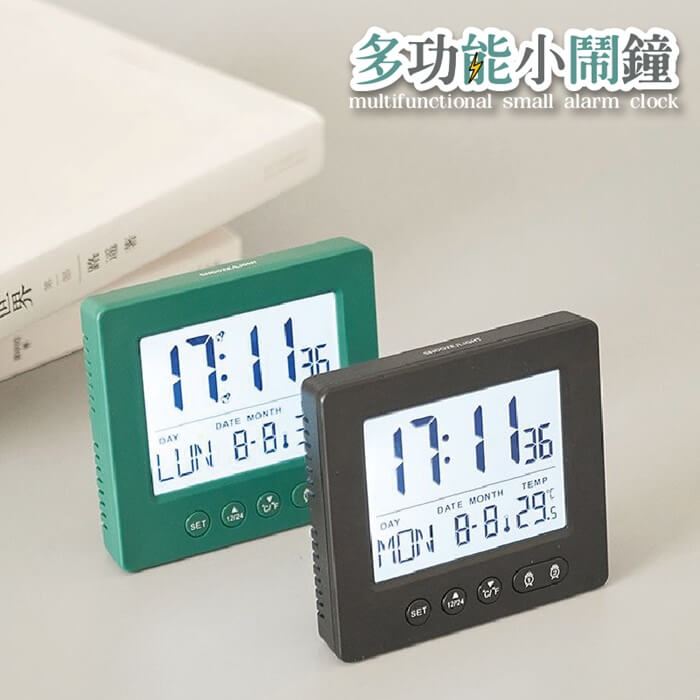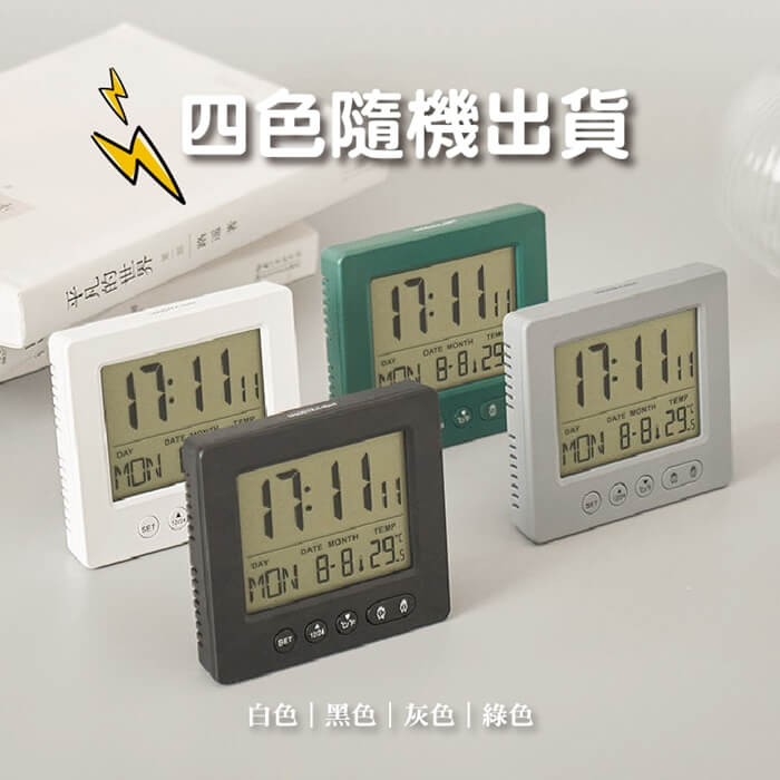 - 主商品尺寸/規格/重量/密度:品名:超薄桌面智能液晶電子鐘(超值2入) 尺寸:8.4x9.1x3cm(±5%) 電池:4號電池x2(需自備) 顏色:白色、灰色、黑色、墨綠色(隨機出貨)