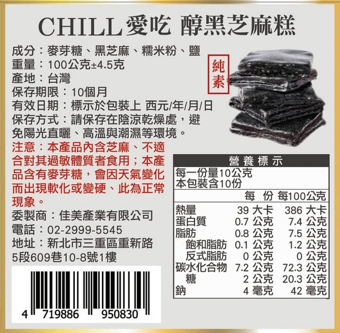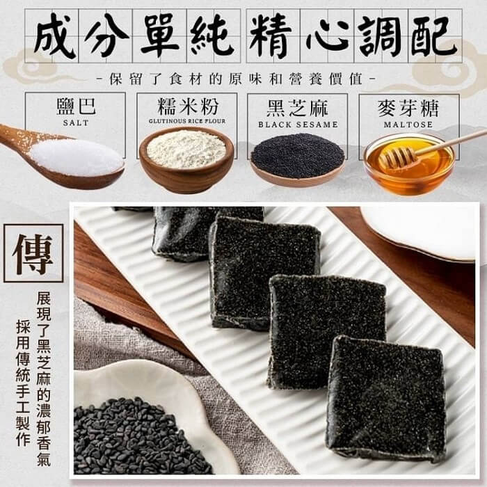 - 主商品尺寸/規格/重量:【產品規格】 品名 : 醇黑芝麻糕/純素 成份:麥芽糖、黑芝麻、糯米粉、鹽 規格:100g±4.5g 保存期限:10個月 有效日期:標示於包裝上 有效日期說明:150~300天,以消費者收受日起算,至少距有效日期前150日以上 保存方式:請保存在陰涼乾燥處,避免陽光直曬、高溫與潮溼等環境 產地:台灣 【注意事項】 ※過敏源提示: 本產品內含芝麻,不適合對其過敏者食用 ※本產品含有麥芽糖 會因天氣變化而出現軟化或變硬.此為正常現象