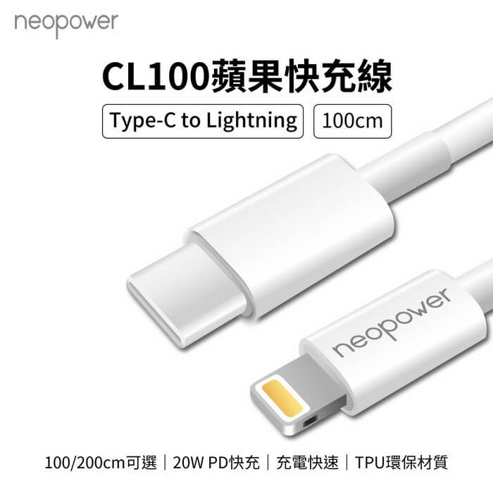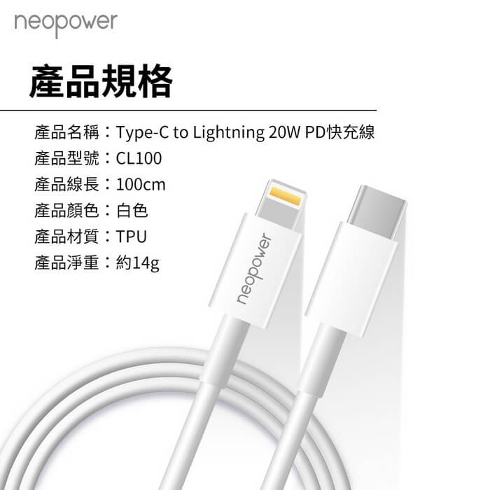 - 主商品尺寸/規格/重量/密度:品名:Type-C to Lightning 20W PD快充線 (1M) 型號:CL100 顏色:白色 產品尺寸:100cm 產品淨重:約14g 包裝內容:Type-C to Lightning 20W 充電線 (1M)×1 保固:90天(非人為因素) 備註:此賣場不含主機相關展示商品 注意事項:鑑賞期非試用期,商品除非拆封後發現有新品不良,否則一經拆封,恕無法辦理退貨