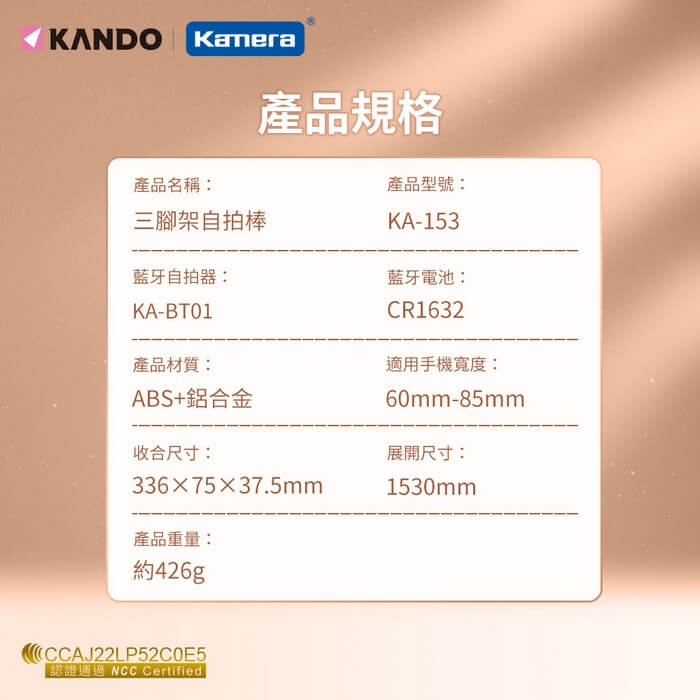 - 主商品尺寸/規格/重量/密度:型號:KA-153 顏色:黑色 藍牙自拍器:KA-BT01 藍牙電池:CR1632 產品材質:ABS+鋁合金 NCC認證:CCAJ22LP52C0E5 適用手機寬度:60mm-85mm 展開尺寸:1530mm 產品尺寸:336×75×37.5mm 包裝尺寸:約340×80×48mm 產品淨重:約426g 產品毛重:約499.4g 包裝內容:三腳架自拍棒X1,說明書X1 保固:180天(非人為因素) 備註:此賣場不含主機相關展示商品
