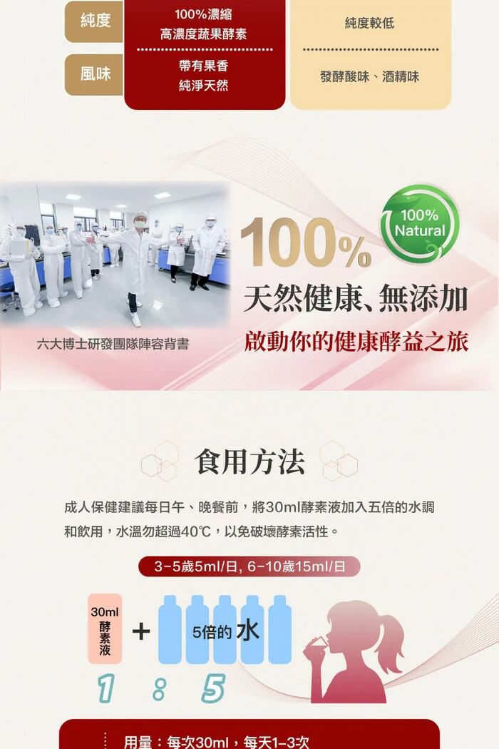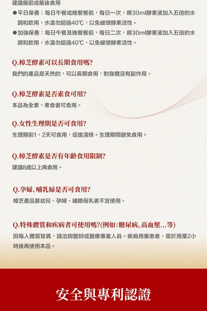 - 每日攝食方式/量:食用方式:建議每日午、晚餐前,將30ml酵素液加入五倍的水調和飲用,水溫勿超過40℃,以免破壞酵素活性。 適用族群:8歲以上全人群日常保健適用。 注意事項:注意事項/藥品禁忌/緊急處理方法/警告標示:請置於陰涼乾燥處,避免日曬,倒置或劇烈搖晃,放置於陰涼幹燥處,開封後請盡快食用完畢。如有沈澱物實屬正常現象,敬請安心飲用。請置於嬰幼兒不易取得之處。重大疾病服用藥物者、或是計劃接受藥物治療者、或孕乳婦應請教醫師或醫療專業人員後再食用。*牛樟芝產品嬰幼兒、孕婦、哺餵母乳者不宜使用