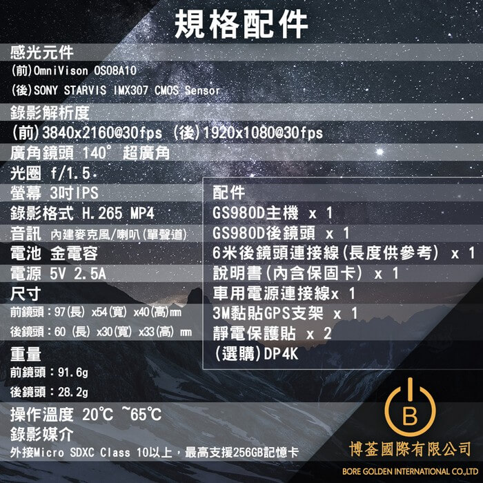 - 主商品尺寸/規格/重量/密度:錄影解析度 (雙鏡)4K@30fps + 2K@30fps / 1080p@60fps + 1080p@60fps (單鏡)4K(3840x2160@30fps) / 2k(2560x1440@60fps) / 1080p(1920*1080@120fps) 感光元件 (前)OmniVison OS08A10 (後)SONY STARVIS CMOS Sensor 廣角鏡頭 140°超廣角 光圈 f/1.4 感光度 最高支援至ISO 6400 液晶螢幕 3吋IPS 錄影格式 H.265 MP4 *支援Windows Media Player 12含以上 錄影媒介 外接Micro SDXC Class 10以上,最高支援512GB記憶卡 *建議使用U3高速讀寫記憶卡 音訊 內建麥克風/喇叭(單聲道) 電池 金電容 電源 5V 2.5A 尺寸 前鏡頭:97(長) x54(寬) x40(高)mm 後鏡頭:60 (長) x30(寬) x33(高) mm 重量 前鏡頭:91.6g 後鏡頭:28.2g 操作溫度 -20℃ ~65℃