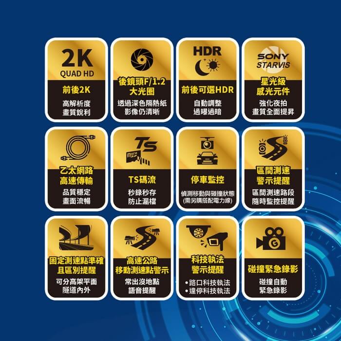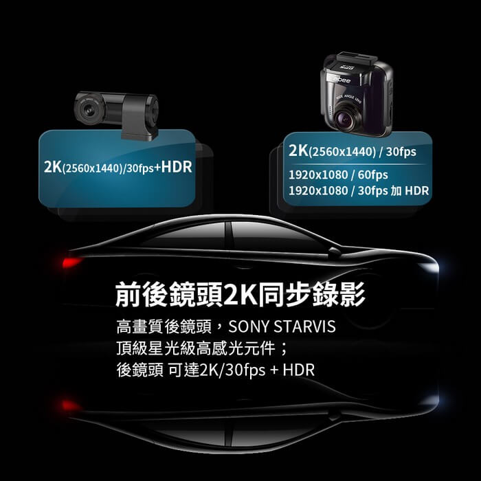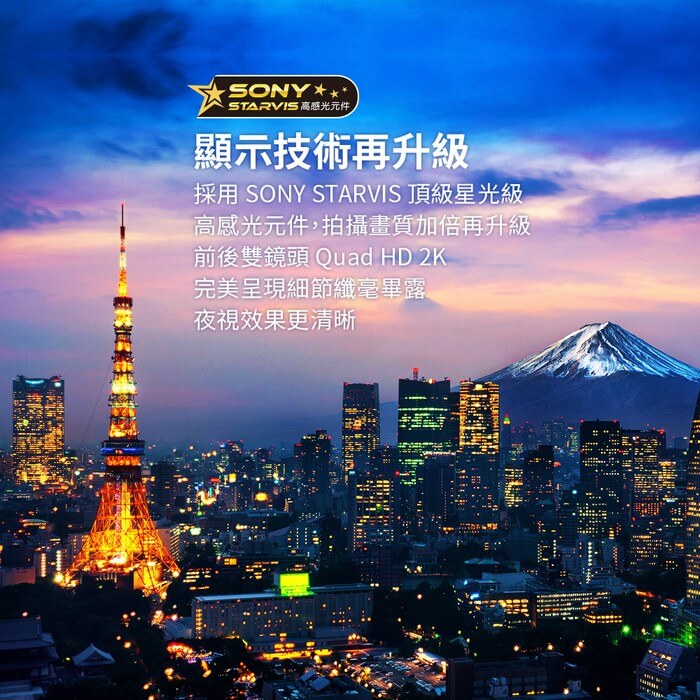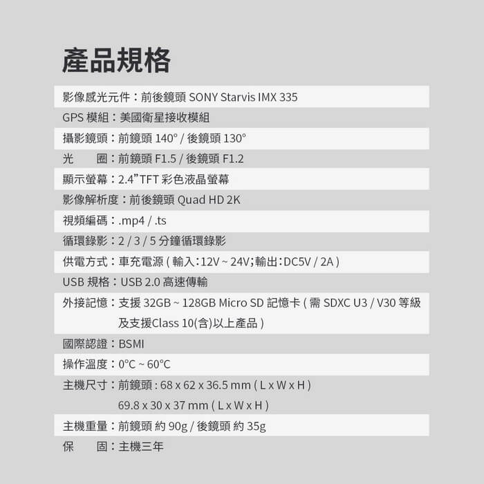 - 主商品尺寸/規格/重量/密度:影像感光元件:前後鏡頭SONY Starvis IMX 335 GPS 模組:美國衛星接收模組 攝影鏡頭:前鏡頭140°/後鏡頭 130°光|圈:前鏡頭F1.5/後鏡頭 F1.2顯示螢幕:2.4”TFT彩色液晶螢幕影像解析度:前後鏡頭Quad HD 2K視頻編碼:.mp4/.ts 循環錄影:2/3/5分鐘循環錄影 供電方式:車充電源(輸入:12V~24V;輸出:DC5V/2A) USB 規格:USB 2.0高速傳輸 外接記憶:支援32GB~128GB MicroSD記憶卡(需 SDXC U3/V30等級 及支援Class 10(含)以上產品) 國際認證:BSMI 操作溫度:0℃~60℃ 主機尺寸:前鏡頭:68x 62x36.5 mm (Lx WxH) 69.8x30 x37mm (Lx WxH) 主機重量:前鏡頭約90g/後鏡頭 約 35g 保 固:主機三年