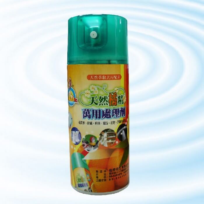 - 主商品尺寸/規格/重量/密度:【商品規格】 品名 : 天然橘精萬用處理劑 規格 : 150ml/瓶 成份 : 天然萃取橘精、檸檬精油、推進劑 保存期限 : 5年 製造日期 : 標示於外包裝 有效日期說明: 913天~1825天,以消費者收受日起算,至少距有效日期前913日以上 產地:台灣 【使用方式建議】 ※奇異筆黑垢:噴於白板污垢處 20~30秒後,以乾布擦拭。 ※雙面黏膠貼紙:去除黏膠貼紙上的防水膜面,噴於黏膠上1~2分鐘,再以膠尺去除已軟化溶解之膠質,再以乾布擦拭即可。 ※噴漆、柏油、汽車內裝油垢:噴塗於髒污表面停留3~4分鐘,待油污溶解,再以乾布擦拭即可。 ※衣物油污、口香糖:噴塗於衣物髒污處停留3~4分鐘,去除口香糖,油污以刷子搓洗方式去除髒污,再以清水沖洗即可。 【注意事項】 ※請貯存於陰涼處所,避免火源高溫。 ※不可對眼睛等敏感部位噴灑,不慎誤入眼睛,請沖大量清水。 ※使用時請保持空氣流通。 ※不可使用於噴漆表面,不明材質使用前,請於不明顯角落試驗。 ※使用後空罐,請按資源回收系統回收。