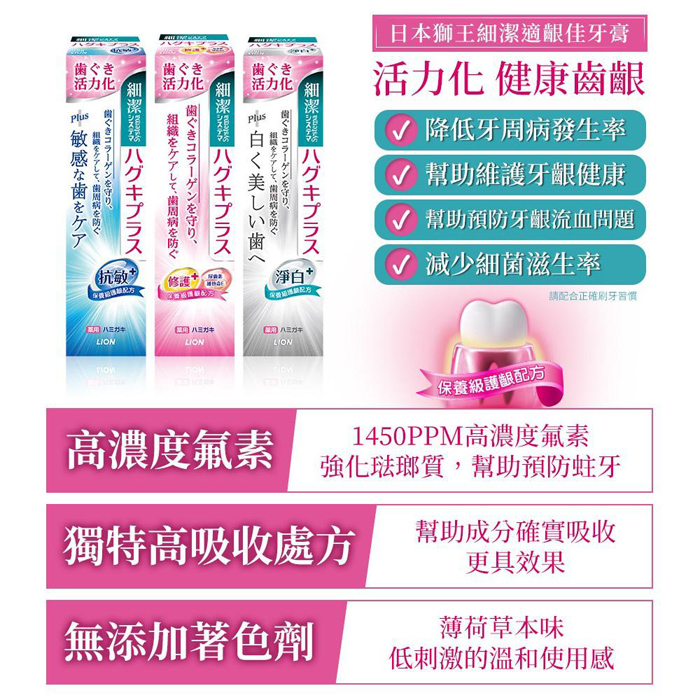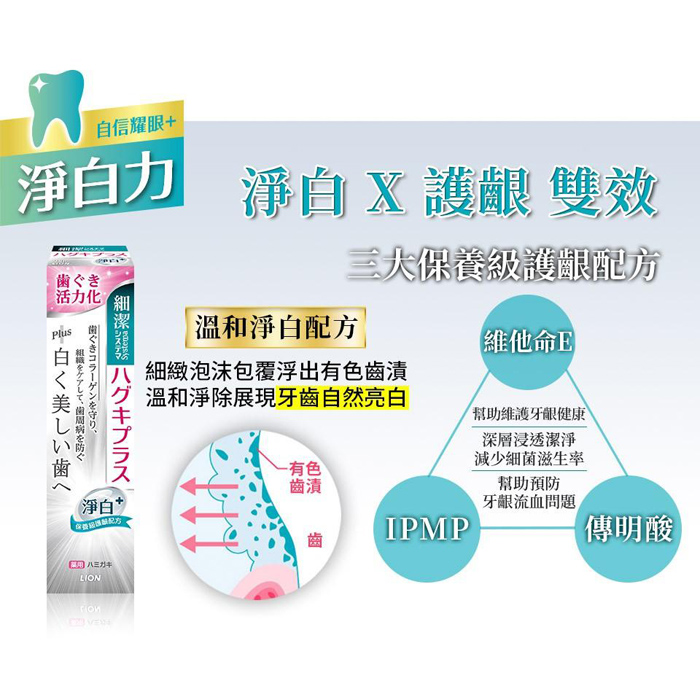 - 主商品:日本獅王細潔適齦佳牙膏plus 90g/淨白plus*3