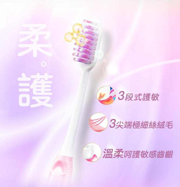 中、外層2段式極細毛,除了更能貼合齒齦,更能在每根刷毛尖端處分岔成3根<0.01mm纖柔毛,進一步舒緩牙齦壓力,如絲絨般柔軟舒適。