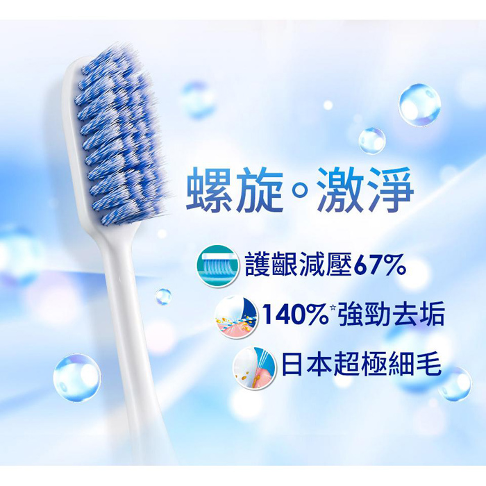 炫絲激淨牙刷 - 超極細毛旋轉成的螺旋細毛,大幅增加與齒面的摩擦點,產生140%的潔淨力,更有效去除齒垢菌斑,徹底乾淨。