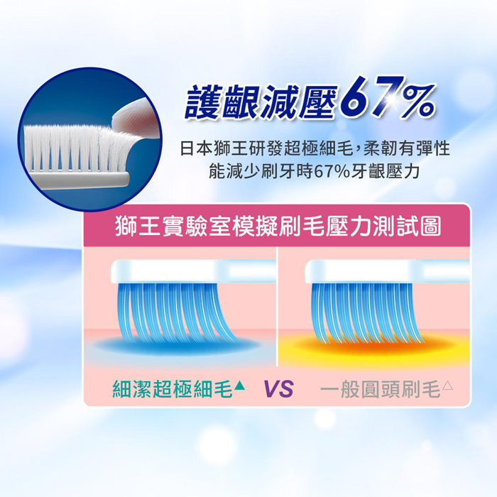 專利超極細毛尖端僅一般刷毛1/10,細微深入牙齦溝,強效去除食物殘渣及牙菌斑,幫助預防牙齦問題。