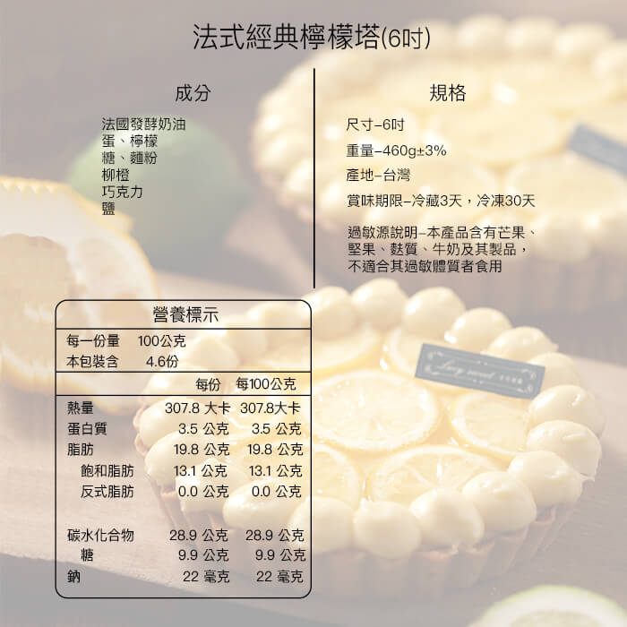 - 主商品尺寸/規格/重量:品名:【LS手作甜點】法式經典檸檬塔(6吋) "檸檬塔是法式甜點中再經典不過的! 以真材實料檸檬餡的清爽系甜點, 檸檬清新的香氣,總能讓味覺有煥然一新的感受。 主廚用口味偏酸的三顆檸檬,微微的酸甜滋味, 吃來一點也不膩人,冰得沁涼入心的餡料, 剛入口就慢慢融化,濃郁中又帶著清爽! 商品規格 重量:6寸/460g 成分:法國發酵奶油、蛋、檸檬、糖、麵粉、柳橙、巧克力、鹽 過敏源說明:本產品含蛋類、堅果、牛奶、麩質之穀物及其製品,不適合其過敏體質者食用" 原產地:台灣 保存期限:總效期1個月/冷凍(-18℃以下) 製造廠商或國內負責廠商名稱: 匯恩科技股份有限公司 製造廠商或國內負責廠商電話:0225078300 製造廠商或國內負責廠商地址: 台北市中山區民權東路三段35號3樓 投保產品責任險字號:富邦產物產品責任險 0523字第23AML0000217號 食品業者登錄字號:A-172921552-00000-1